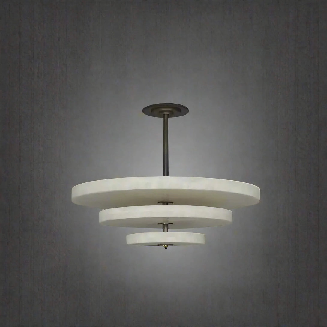 Hand-carved alabaster discs stack in a minimalist three-tier arrangement, anchored by a patinated brass stem for a curated, gallery-grade presence. This sculptural ceiling light casts a warm, even glow, making it a sought-after choice for designers specifying alabaster chandeliers in dining rooms, art-filled entryways, and boutique hospitality interiors.