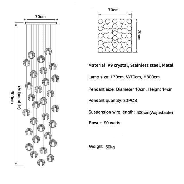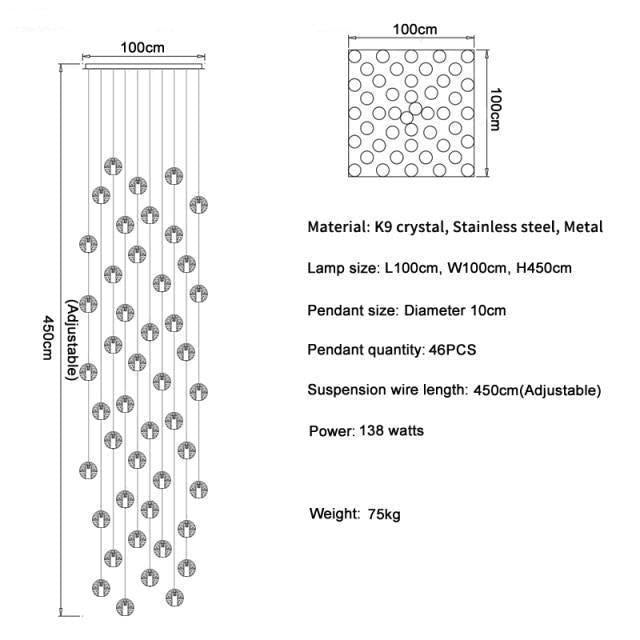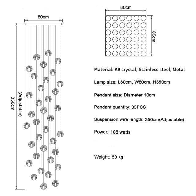Give your 2-story staircase or tall ceiling a modern look with this chandelier. The globe lights appear to suspend in the air loosely which gives the illusion of floating orbs. The globes are made of clear crystal and use a G4 type bulb. The canopy is made of polished steel. See the diagrams for the different styles and measurements. |