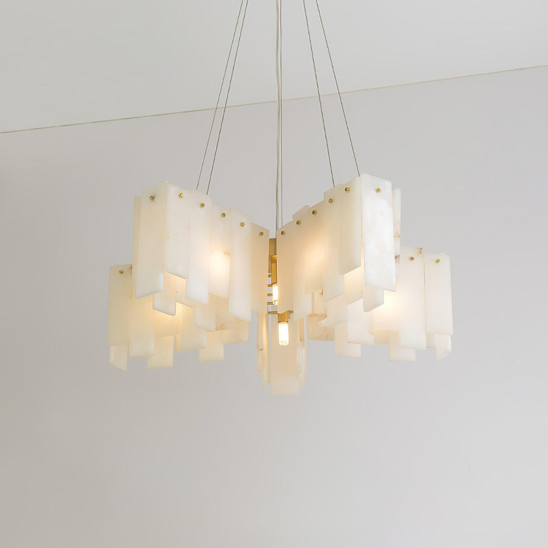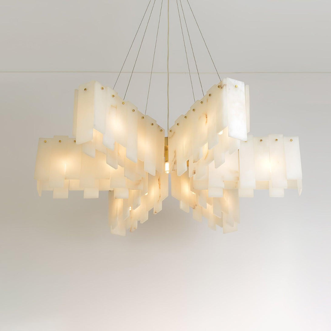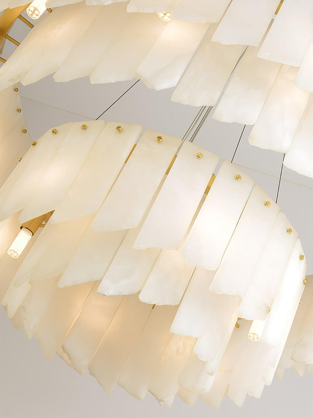 The Alabaster Cascade Tiered Chandelier is a magnificent display of artisanal craftsmanship and opulent design. Gracefully suspended from a brass canopy, this chandelier features layers of sumptuous alabaster panels that descend in a tiered fashion, creating a breathtaking cascade of warm light.