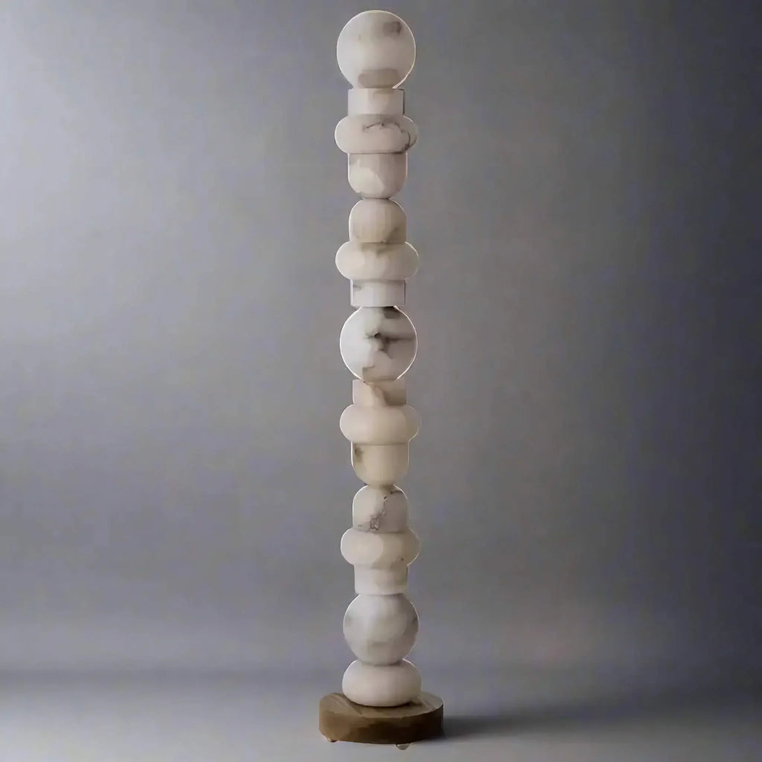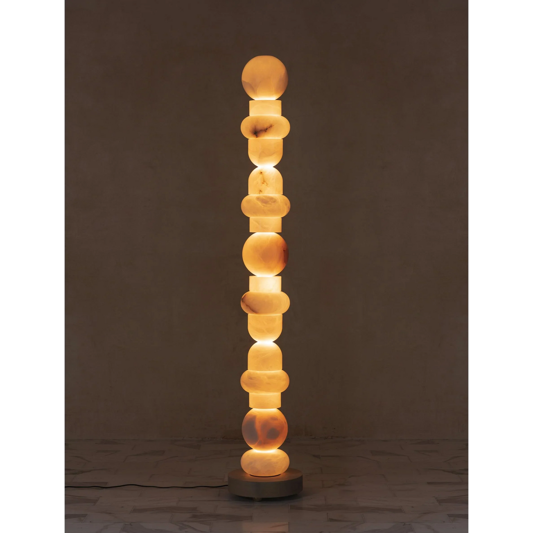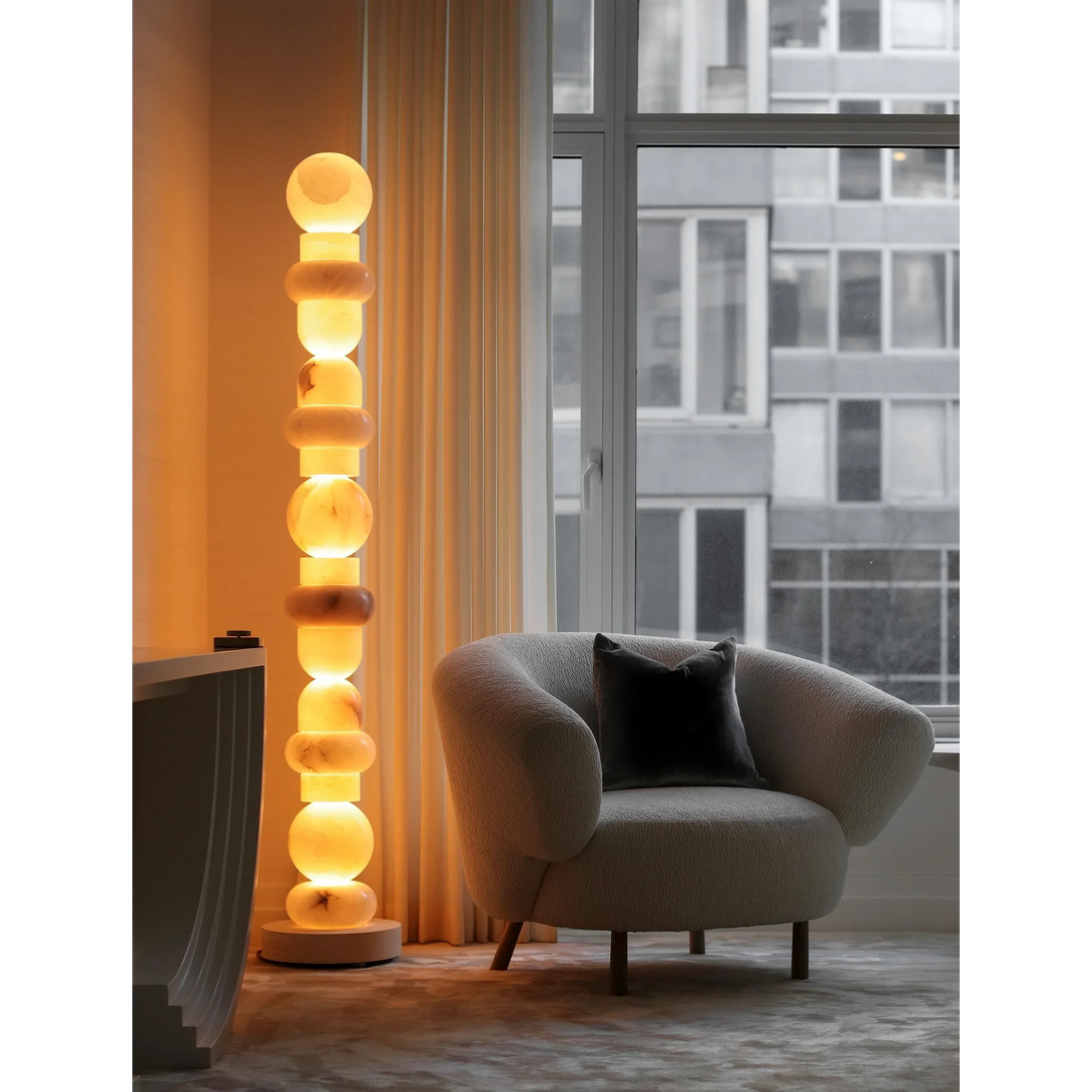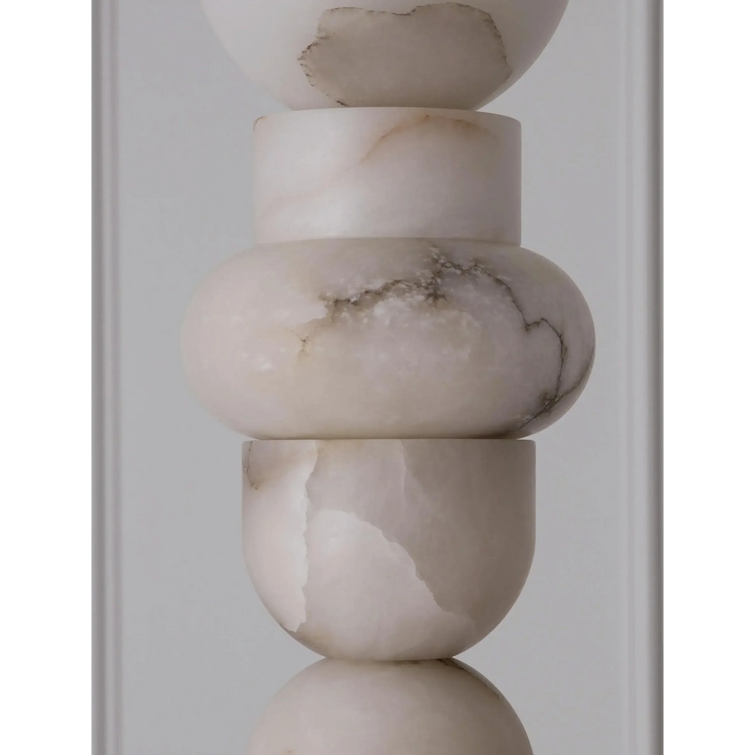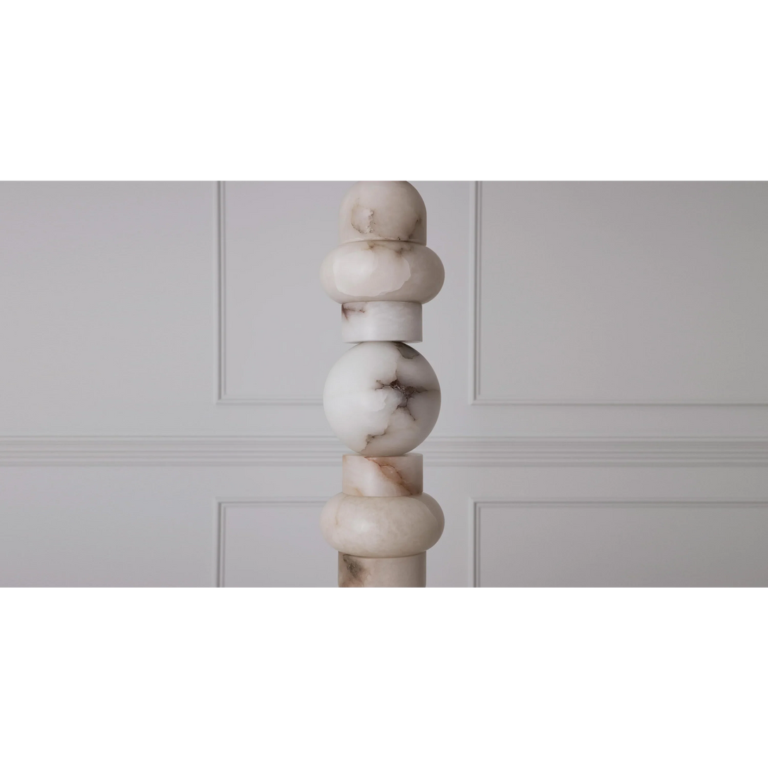 The Alabaster Column Floor Lamp combines natural alabaster stone with a brass and alabaster base for a refined, elegant look. Its tiered column design softly diffuses a warm 3000K glow, illuminating spaces up to 20 m². Perfect for sophisticated living rooms, foyers, or professional settings, this lamp balances artistry with functionality, enhancing interiors with timeless natural beauty.