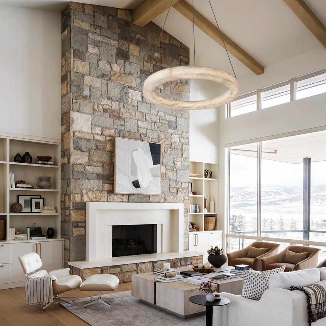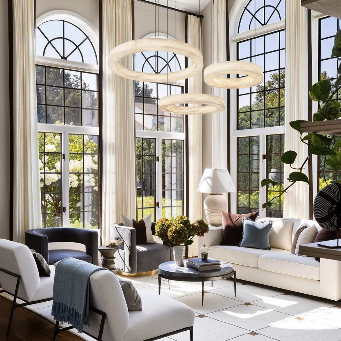 Alabaster Round Chandelier composed of the alabaster rings, and the straps. The straps are made of leather and the color is picked out from various options, makes this alabaster pendant light shines like the luminous halos.