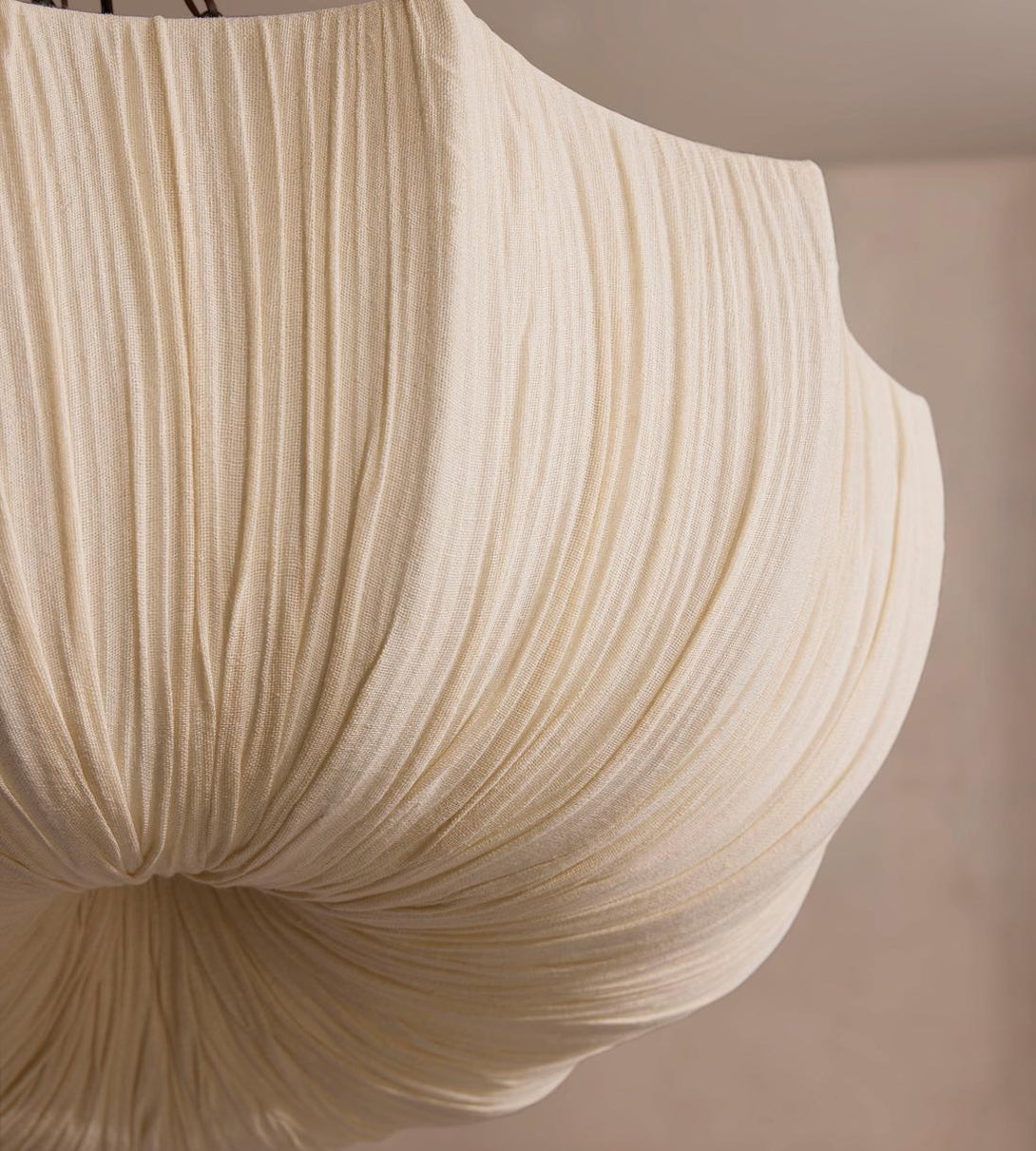 Soft, hand-ruched cotton in a neutral tone contrasts against the blackened brass of this pendant light.