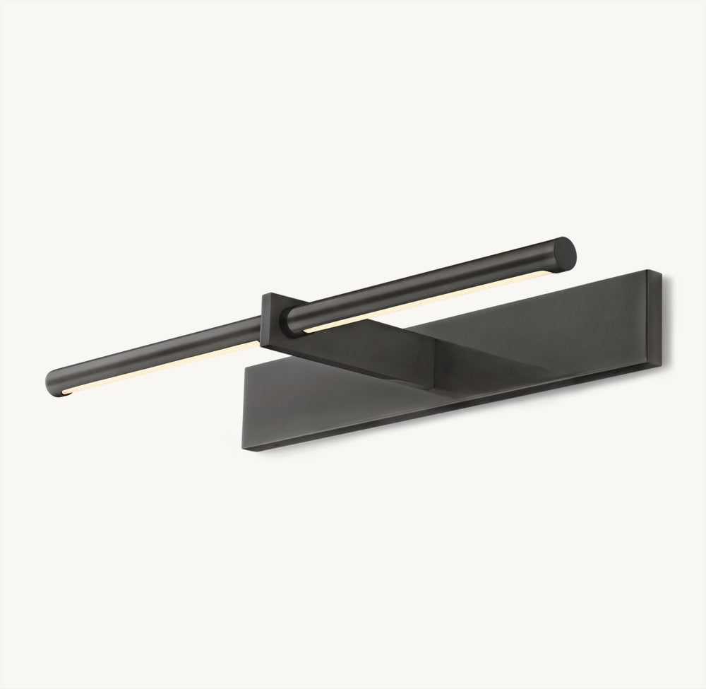 A celebration of line and form, our collection is a postmodern interpretation of the picture light. Handcrafted of brass, an angular frame supports a cylindrical lamp head with integrated LED. Equal parts form and function, the shade swivels to focus light where needed.