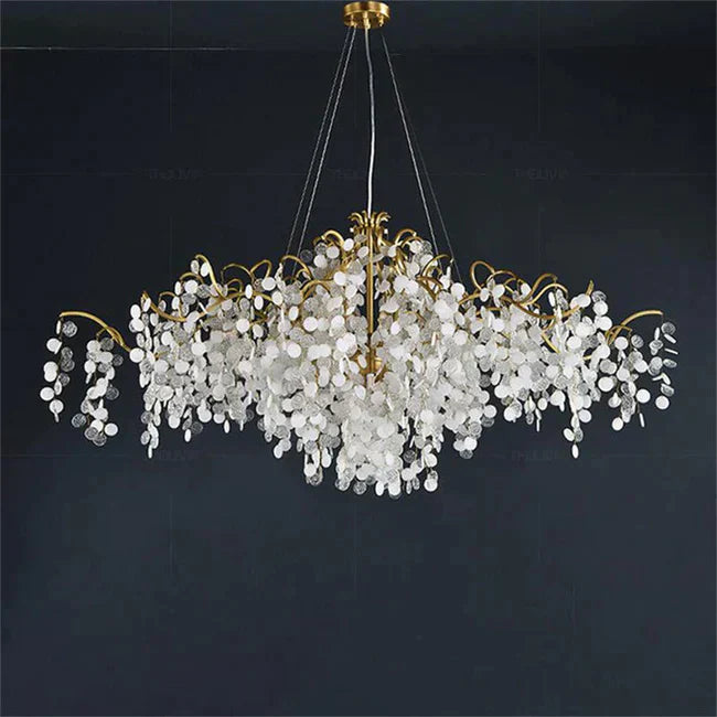 This modern branch chandelier is made of brass and glass,The brass branches are all twisted and shaped by hand, to form a natural and organic look, decorated by the beautiful little coin shape glass. It is very suitable for the dining and kitchen area.