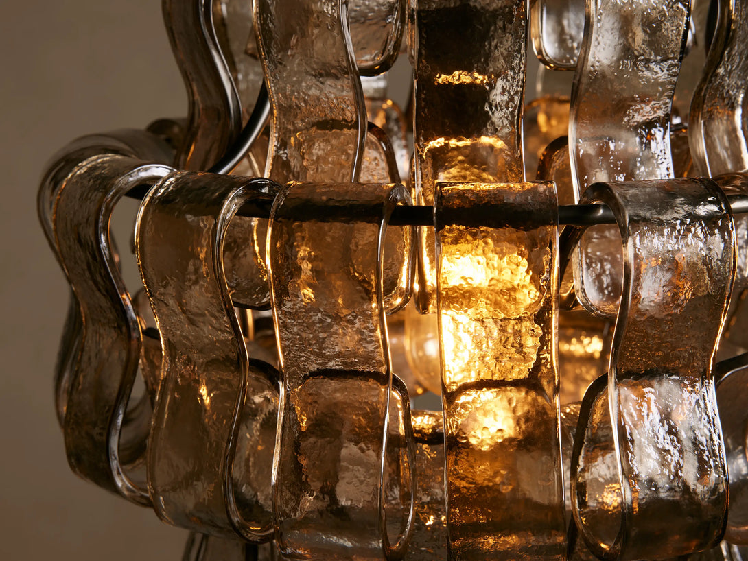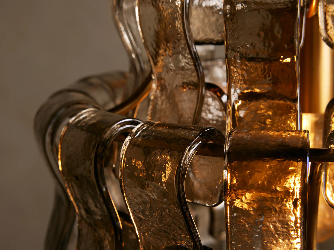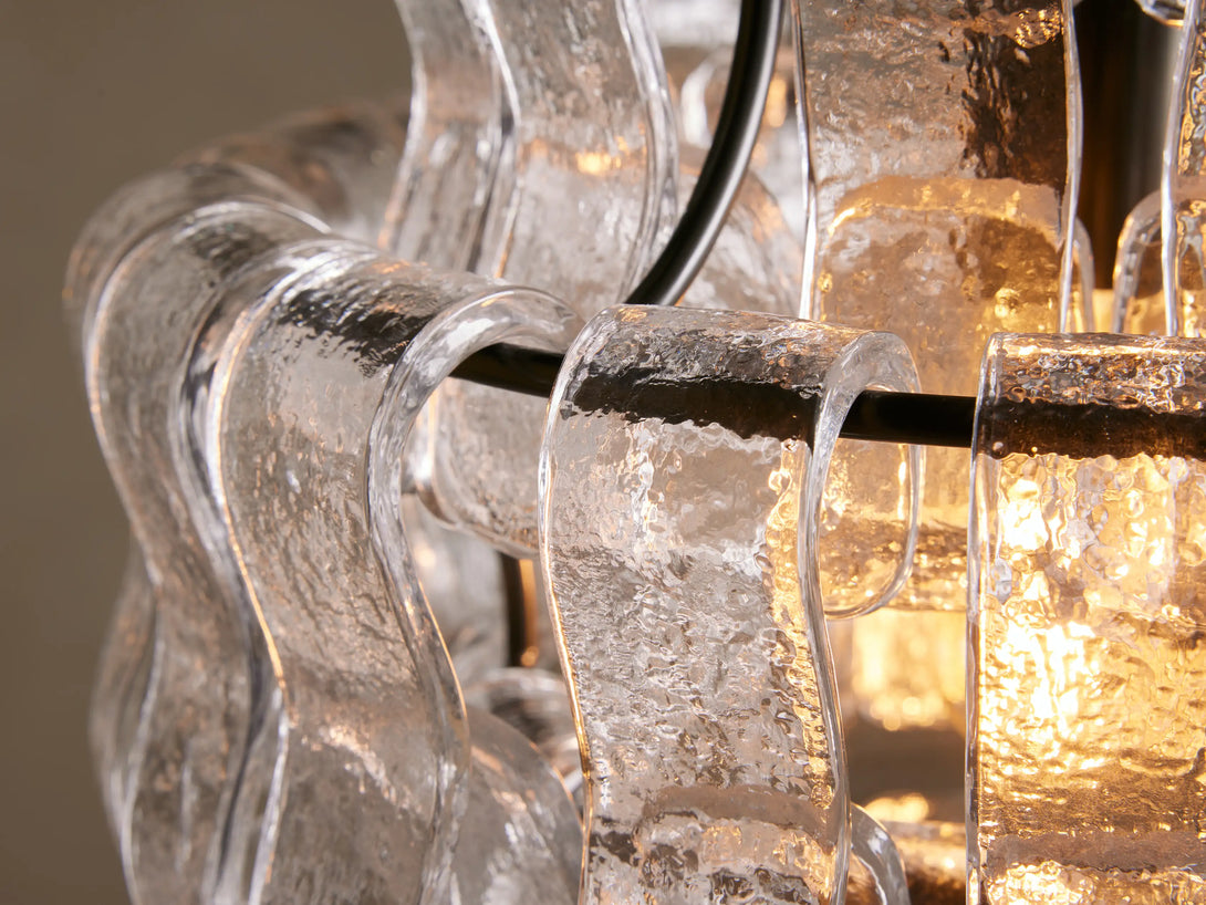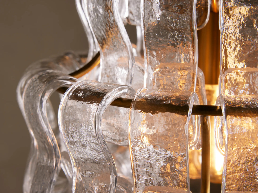 Inspired by the famous Italian decorative glass, the Amor chandelier artfully diffuses light through curved textured glass pieces. It features an electroplated brass finish to elegantly illuminate any room.