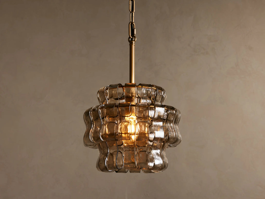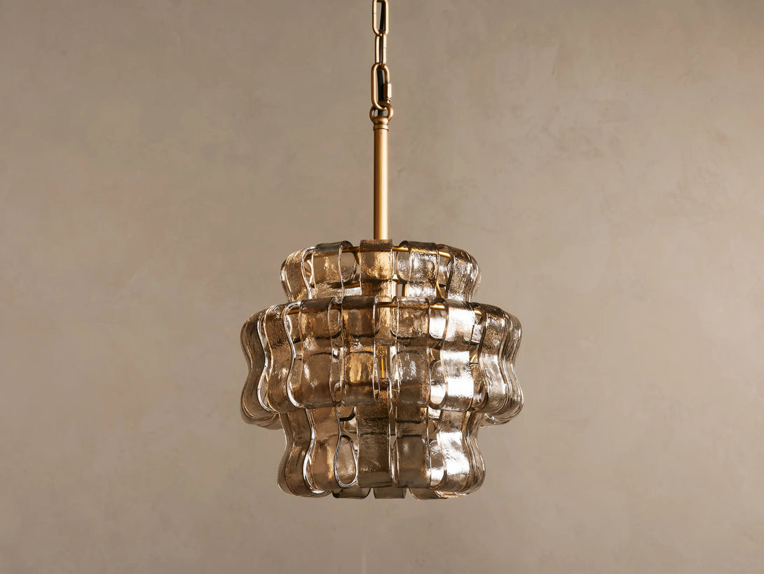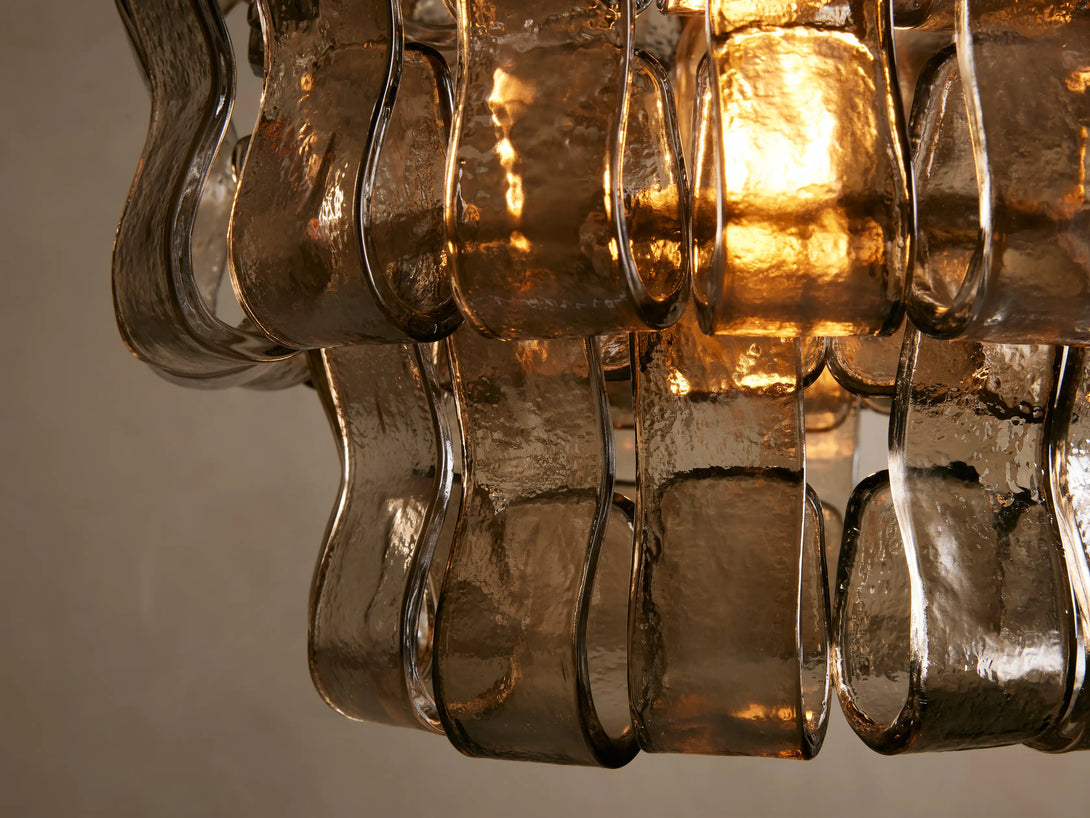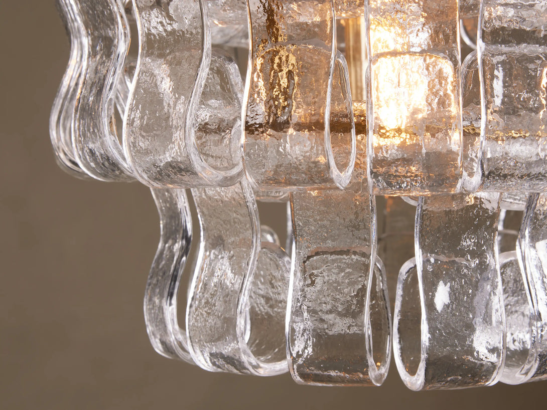 Inspired by the famous Italian decorative glass, the Amor chandelier artfully diffuses light through curved textured glass pieces. It features an electroplated brass finish to elegantly illuminate any room.