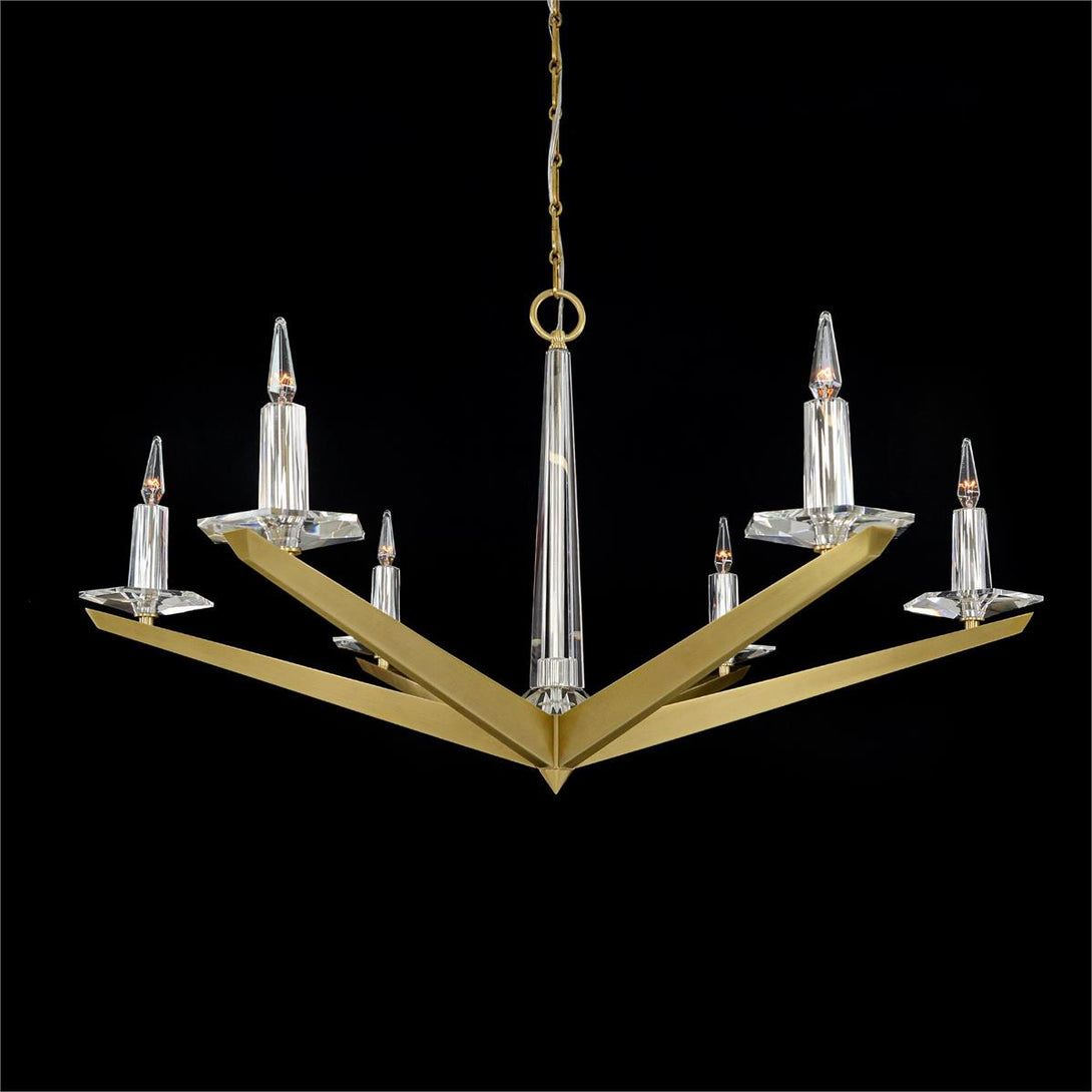 Antares is a striking Art Deco inspired fixture built on the strength and versatility of the ubiquitous hex form that creates a lattice work of elegant Natural Brass metal arms and crystal elements. Distinctive cut crystal candles are the crowning touch for this classic Art Deco design.