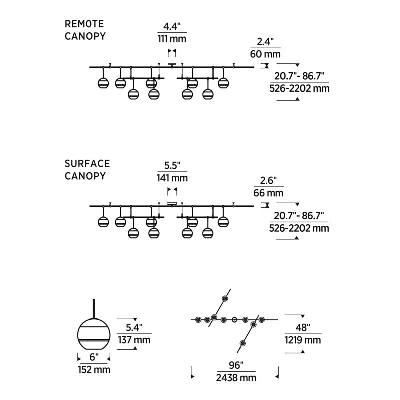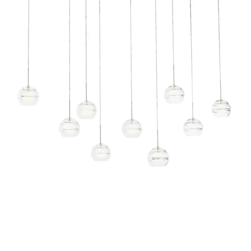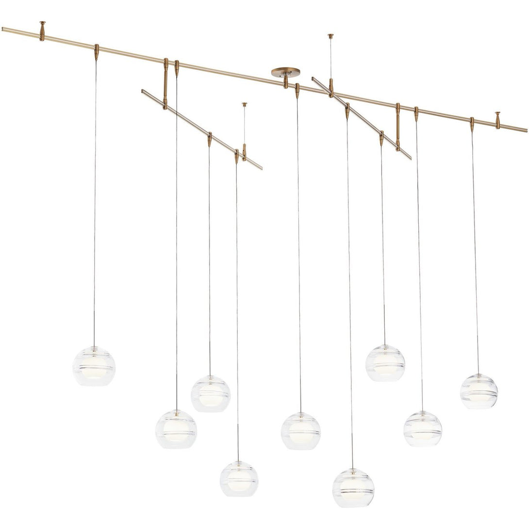 The Sedona Pendant Chandelier is suspended from a sleek glass globe with handcrafted glass bands adorning the interior. The chandelier is designed as a versatile monorail low voltage system with the flexibility to add, remove or move fixtures for a personalised arrangement.
