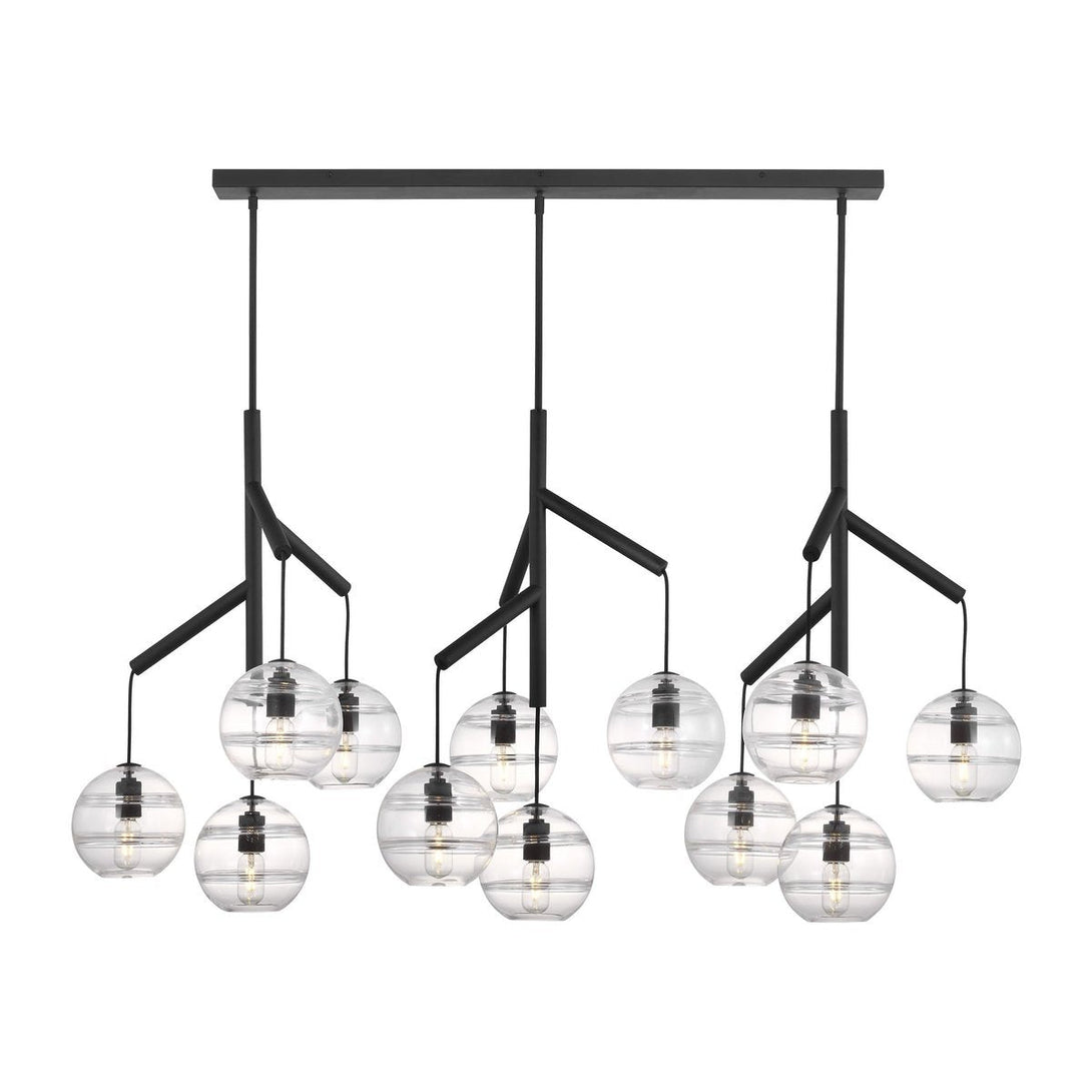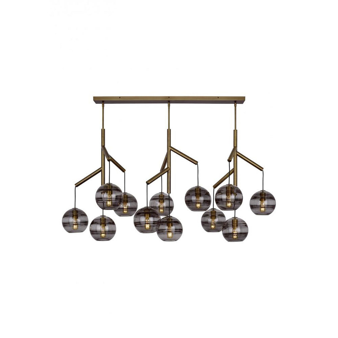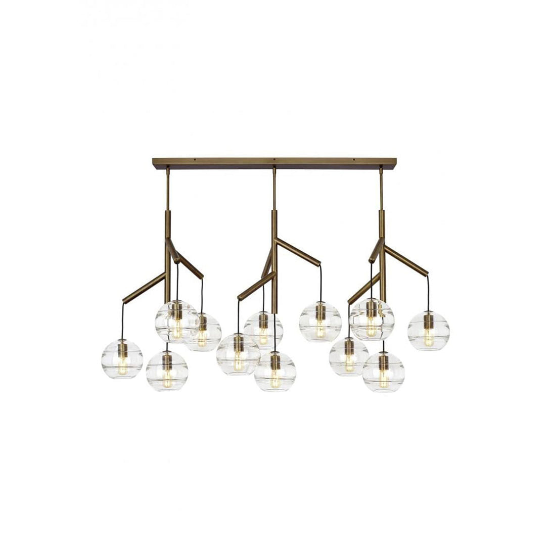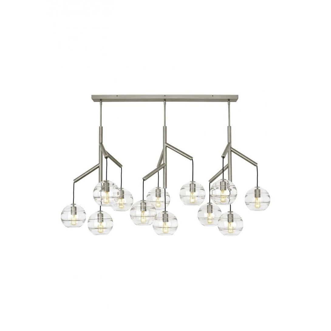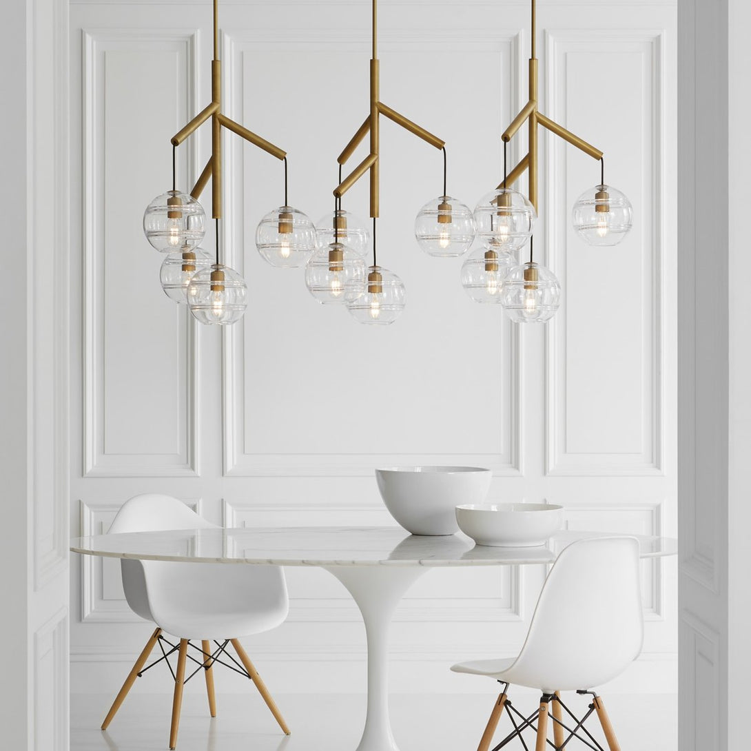 The Sedona Triple Chandelier is the ideal fixture for a modern deconstruction of the classic chandelier. The chandelier consists of three glass spheres, each suspended from a dendritic centre pivot by contrasting fabric cords. The spheres have a smooth outer surface and a thickened band of glass on the inner surface.