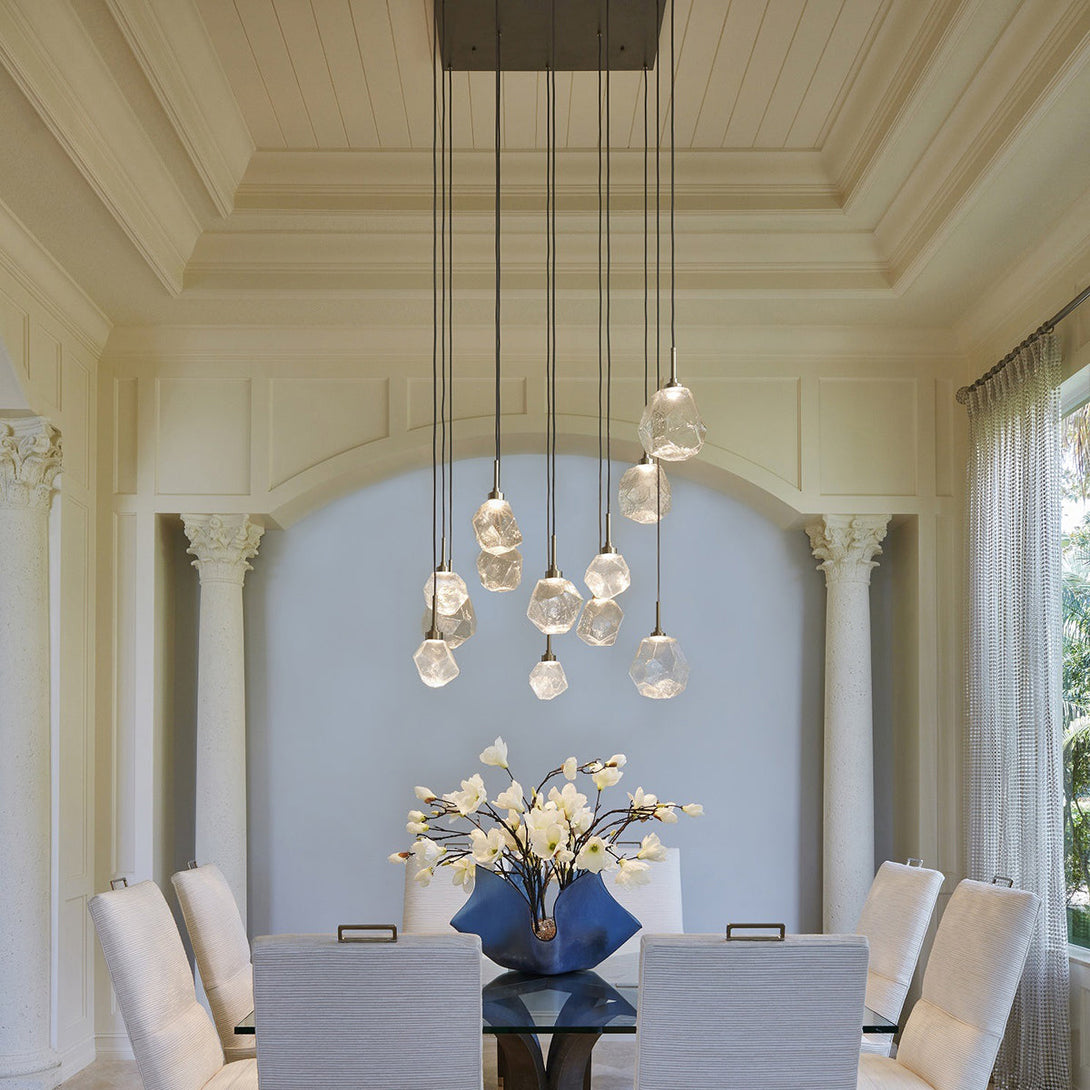 The Square Porous Pendant Light consists of 9 or 12 sparkling LED-illuminated "jewels" made of hand-blown glass suspended from a square canopy. Each glass shade is carefully crafted by artisans.