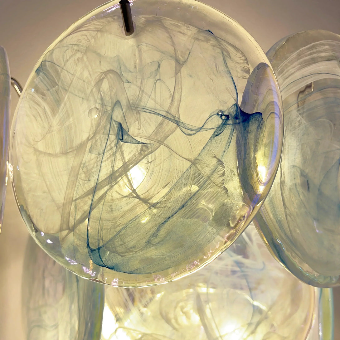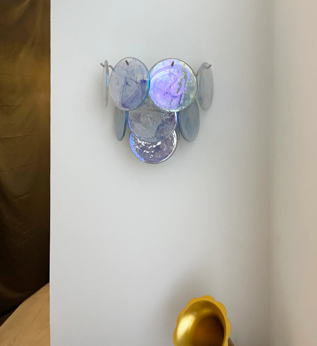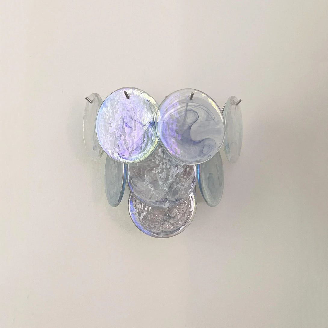 Blue Vintage Murano Glass Wall Lamp, Enhance your space. This wall sconce features a Gold glass disc that reflects stunning colors. Add a touch of beauty and ambiance to any room with its beautiful light and mesmerizing effects.