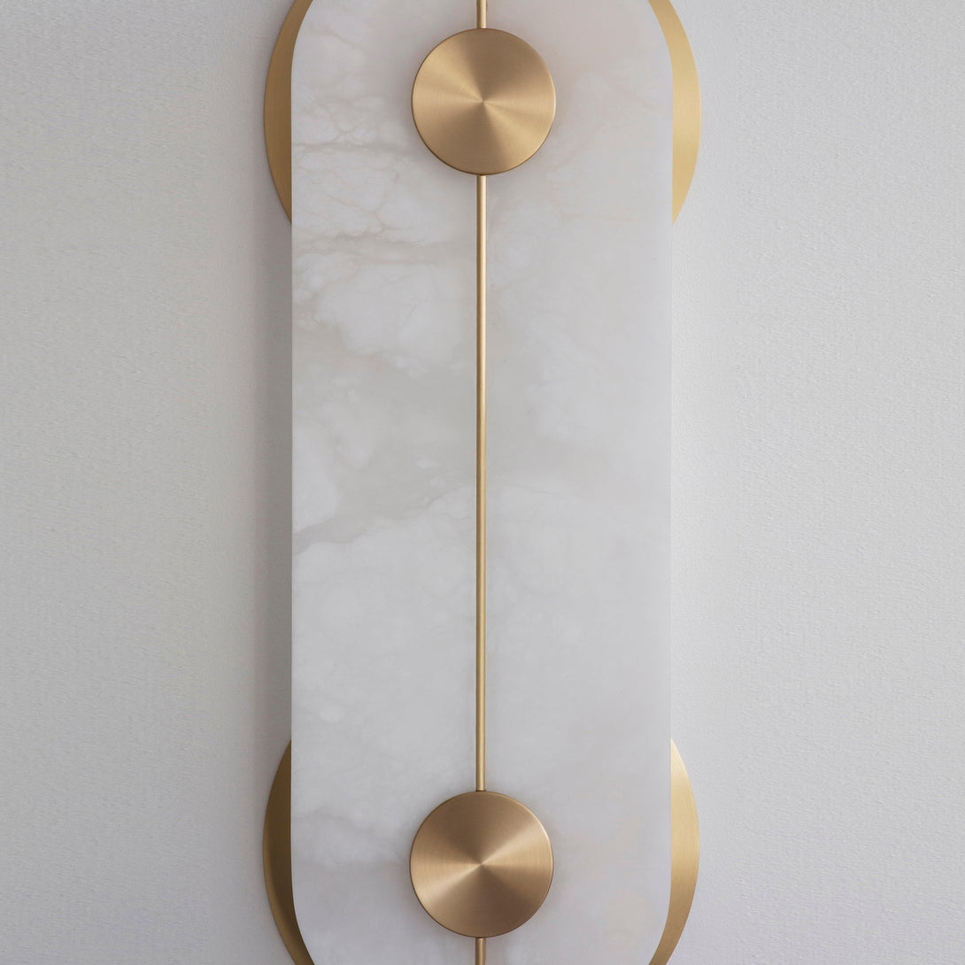 The Brace Wall Lamp features a natural veined alabaster shade elegantly supported by brass bobbins, showcasing refined symmetrical and geometric design elements. It delivers a warm, ambient glow that gently washes the wall while providing subtle illumination to the surrounding space, enhancing any room with understated sophistication.