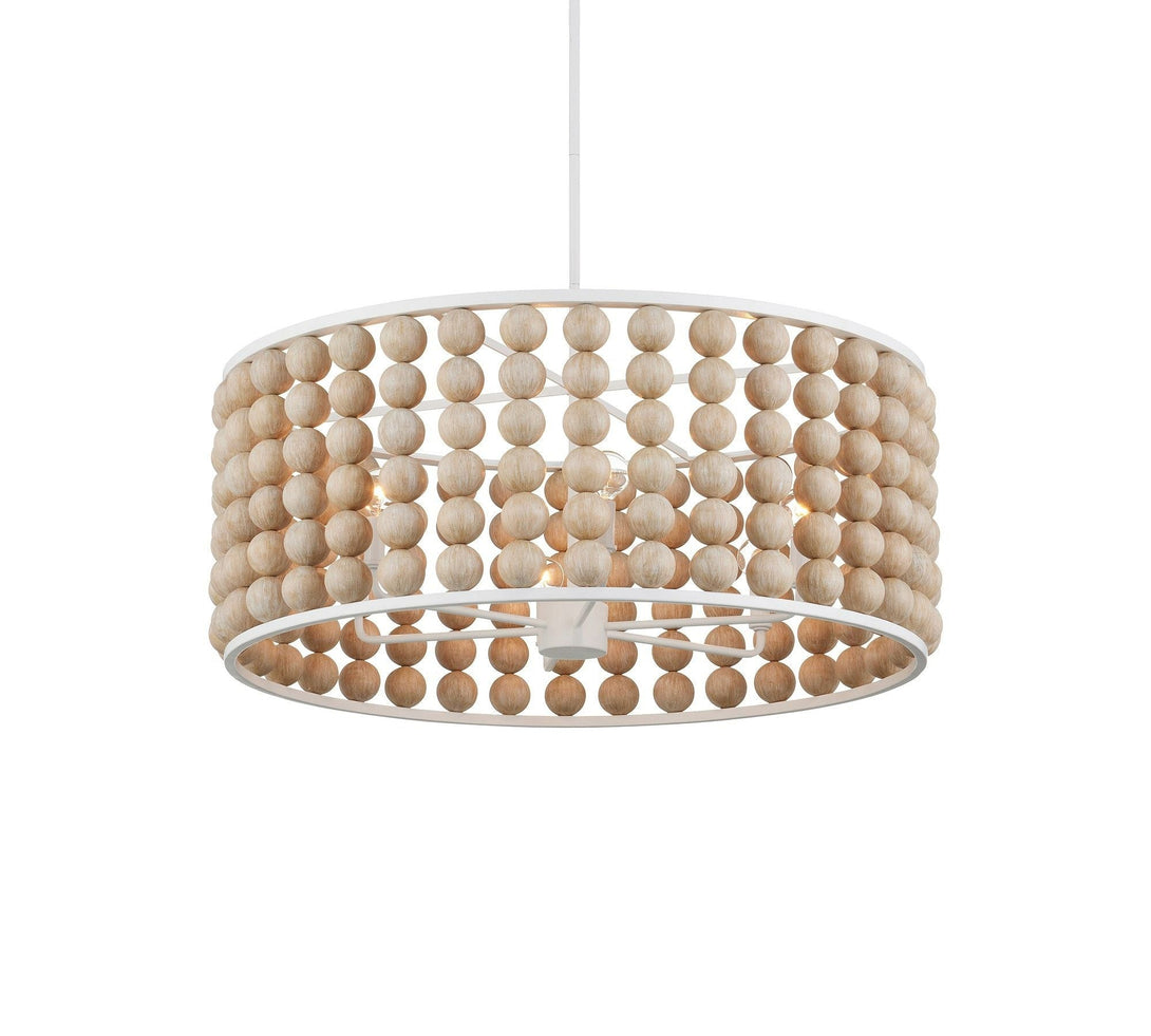 - Handcrafted of wooden beads with a Sandstone finish and iron with a Sugar White finish.