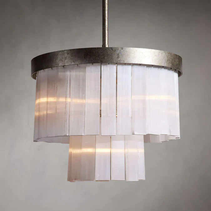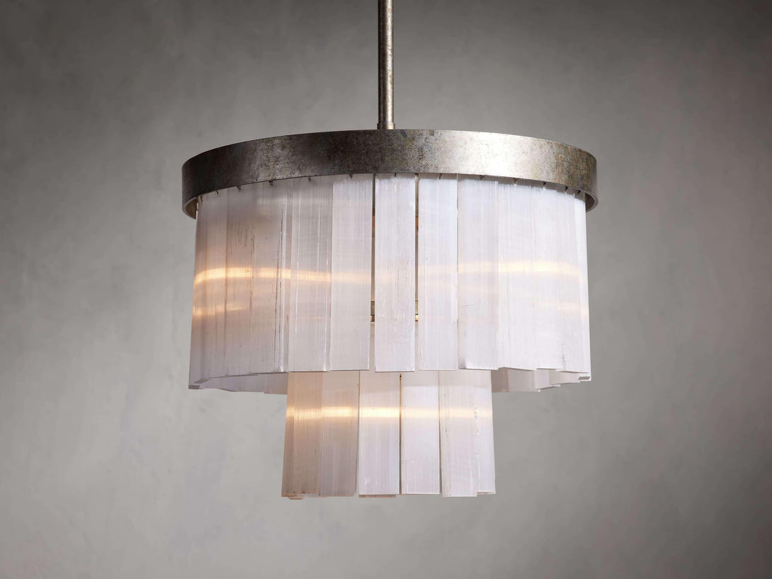 - Adorned with natural selenite crystals, our Cameron Lighting Collection reflects light as they hang elegantly beneath the iron frame. An antiqued silver finish is hand-brushed by our artisans, creating a glamorous aesthetic.