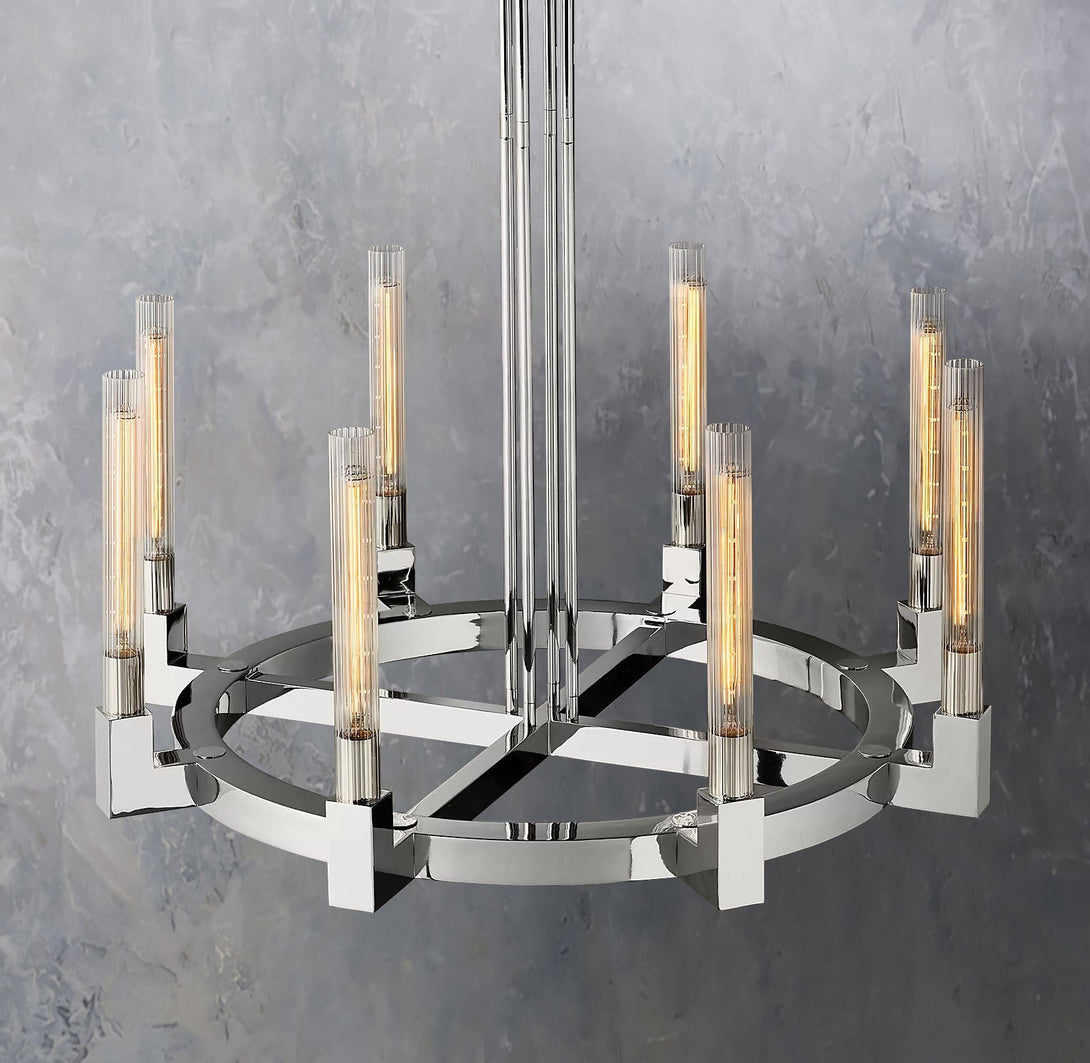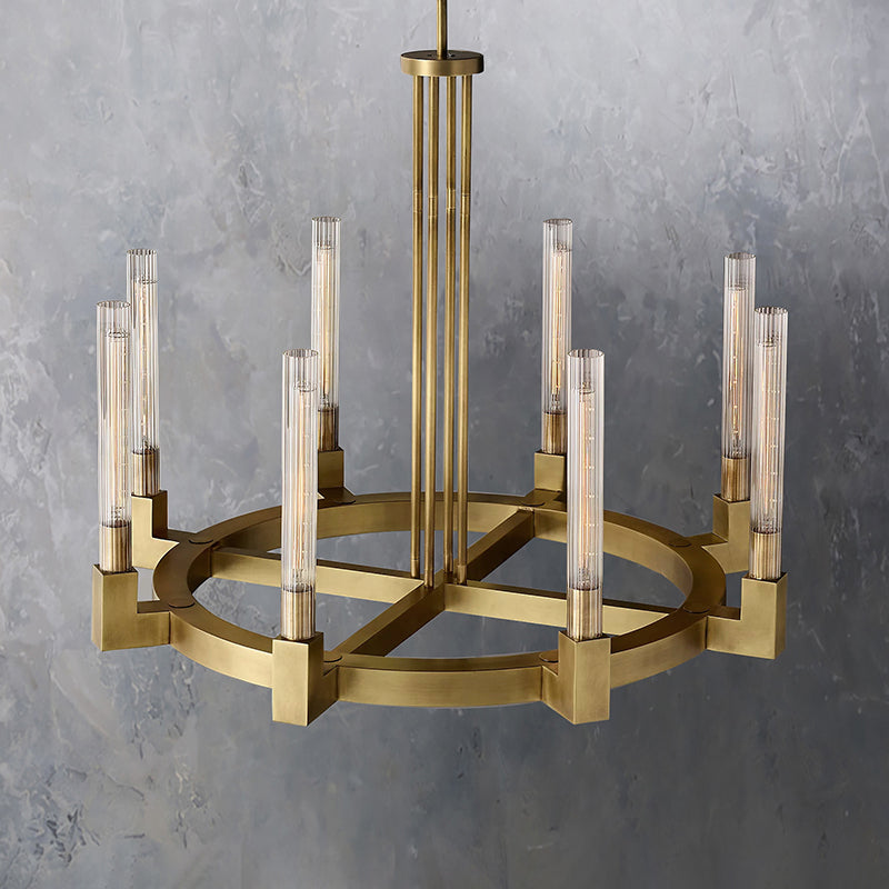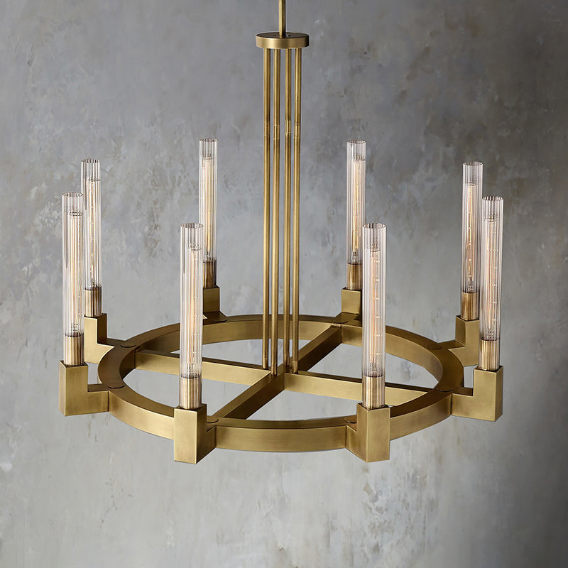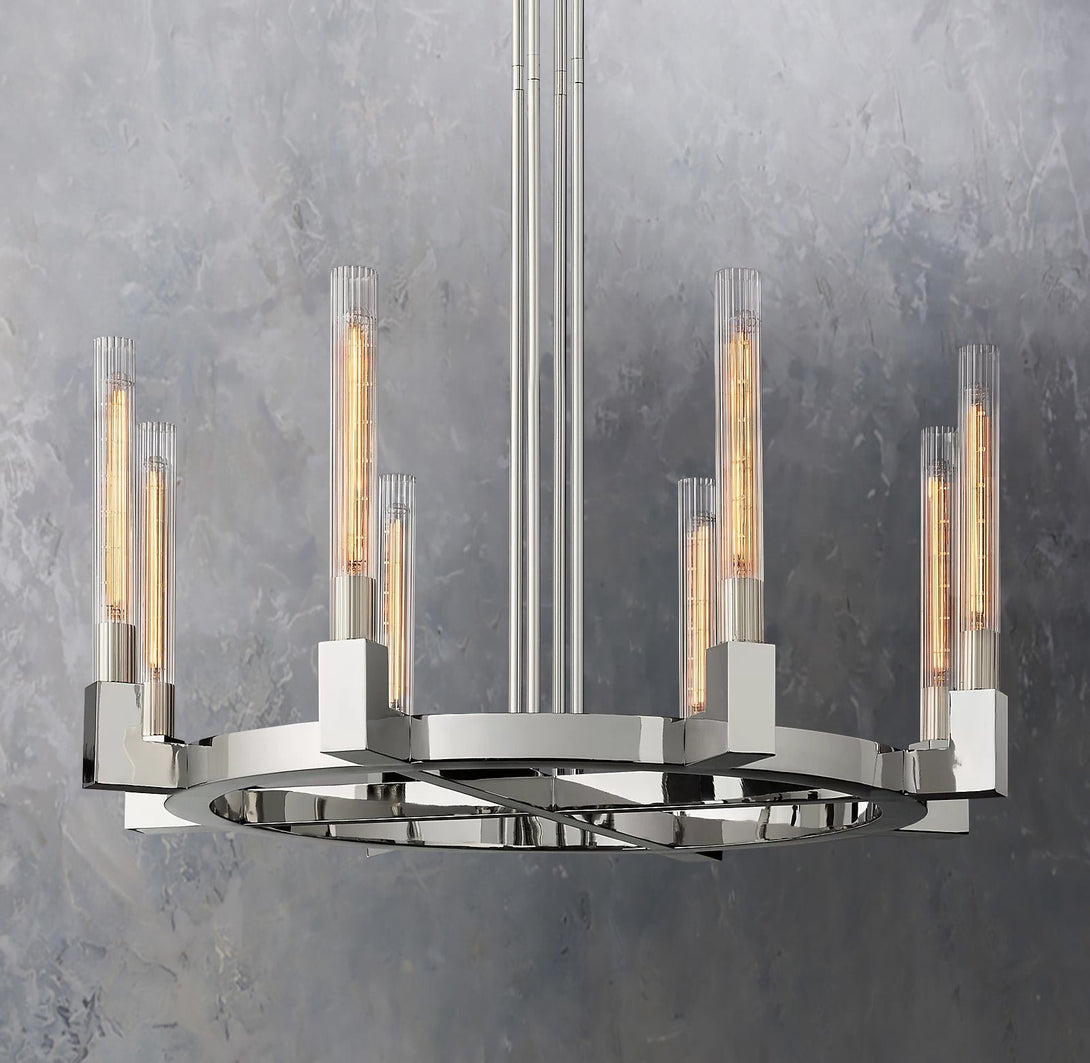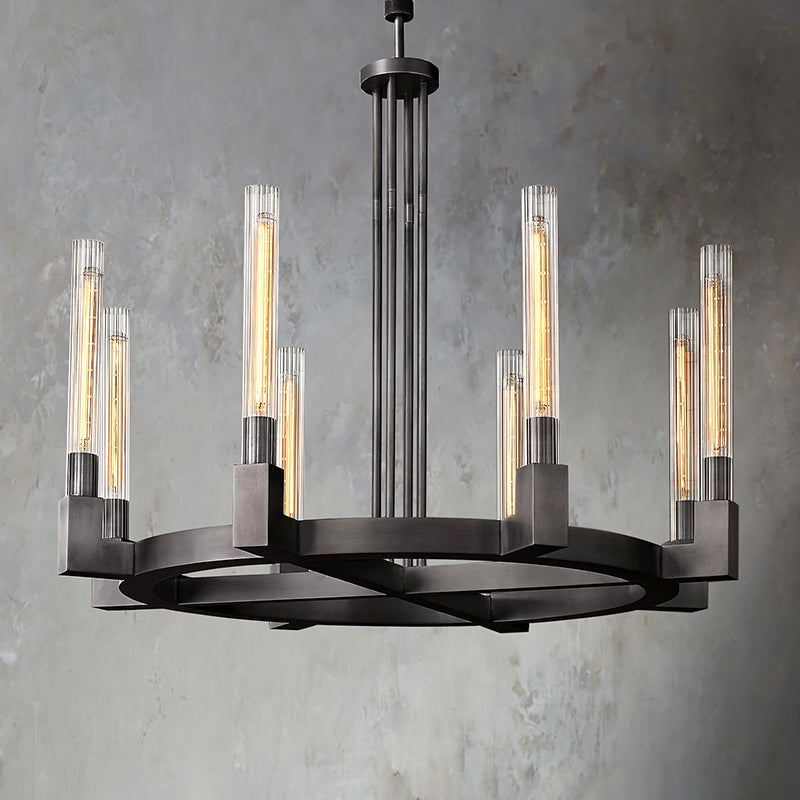 Dimension:Chandelier Body: 36" diam., 17"H ;Inner Ring: 29" diam.; Minimum Height: 17"; Maximum Height: 82"; Rods: eight 6", eight 12" and eight 18"; Canopy: 8" diam., 1½"H; Weight: 45 lbs.