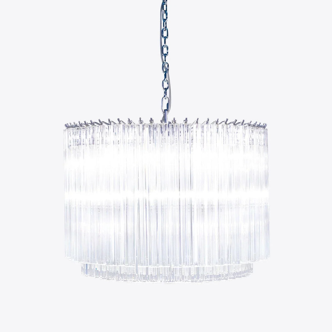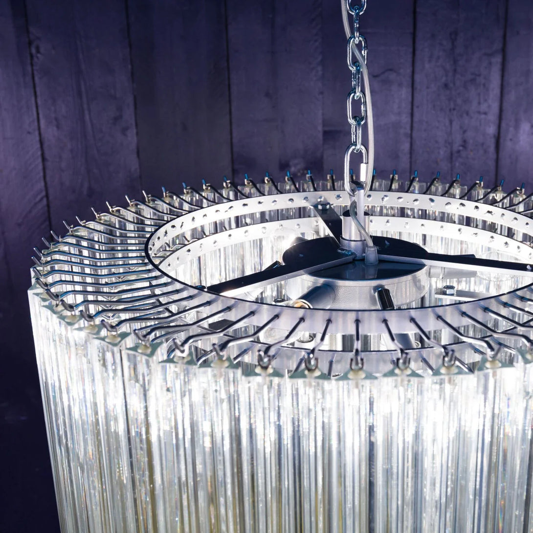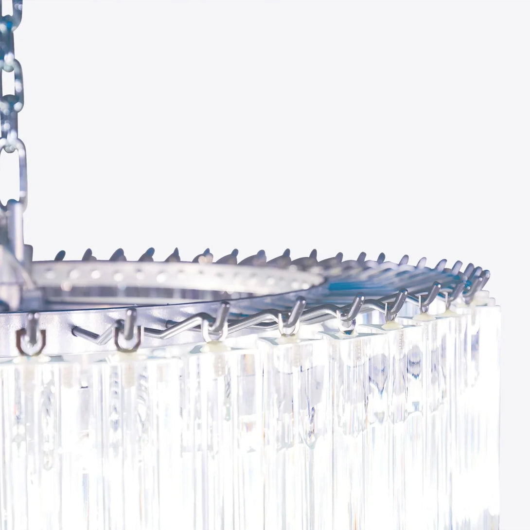 The show-stopping Cannes Murano chandelier is handblown in Italy from Murano glass. Delicate glass triangular prisms individually hang from a nickel-plated iron frame to form a cylindrical formation.