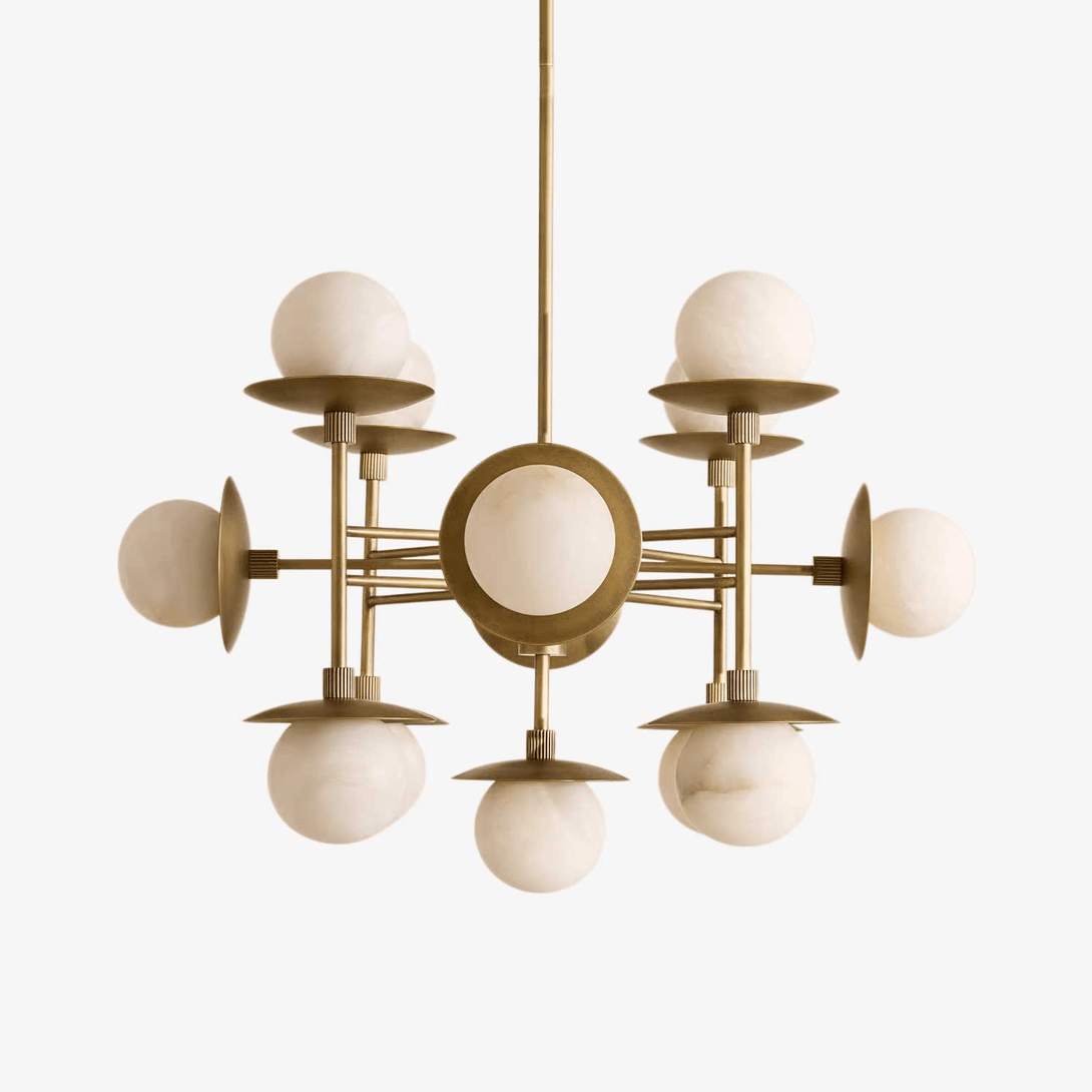 The Cara Chandelier features an architectural stem carved from brass, accented with circular components that securely hold alabaster globe lamps. Drawing inspiration from the bedrooms of House Rome, its globe-shaped lamps are meticulously carved from alabaster stone. The chandelier’s slim, architectural frame and circular details are crafted from genuine brass hardware, combining refined craftsmanship with elegant design to enhance any space.