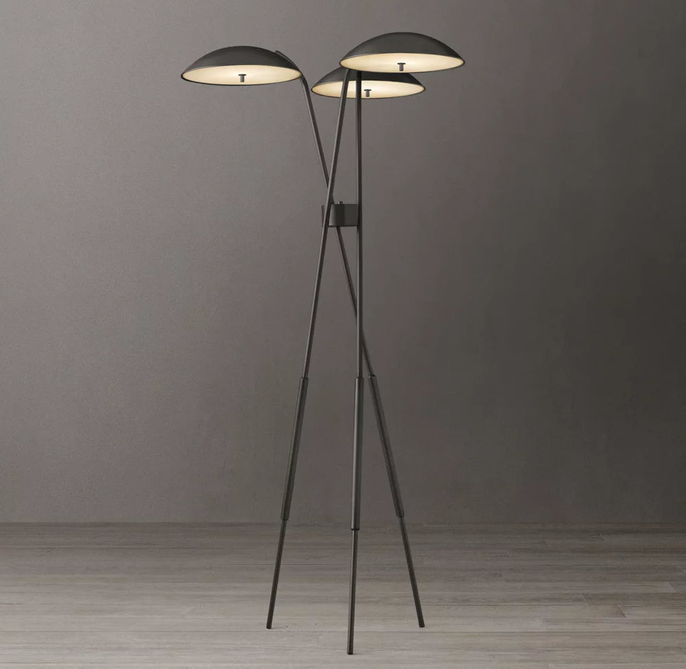Perfectly balanced in scale and proportion, our elegant metal tripod lamp takes its inspiration from the spare, clean-lined silhouettes of the 1950s. Slender, sinuous legs support three shallow, domed metal shades.