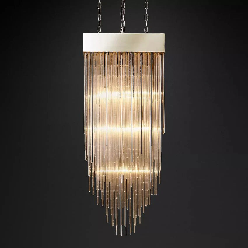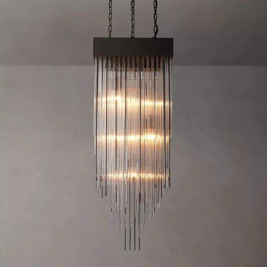 A Ascade of crystal and metal rods coexist in this dazzling display of light. Artfully evoking rainfall frozen in time, hundreds of slender tubes are suspended asymmetrically from a sleek canopy, casting a refractive glow to dramatic effect.