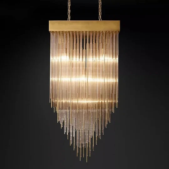 In this collection, crystal and metal rods cascade and coexist as hundreds of slender tubes are hung asymmetrically from a smooth canopy, refracting dramatically and artfully evoking rainfall frozen in time. |