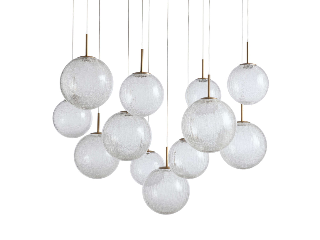 - Crafted from stainless steel with a satin brass finish and a mouth blown solid opal glass globe or crackle glass globe.