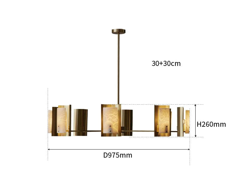 This brass-framed chandelier features hand-carved Spanish alabaster shades, meticulously engineered for warm, even light diffusion and architectural symmetry. The translucent alabaster creates a soft, inviting ambiance, while the precise linear design ensures balanced illumination.