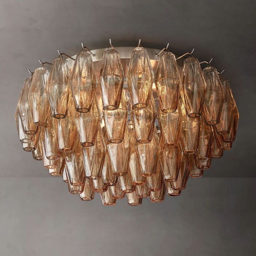 This chandelier is suspended from a tiered steel frame with dozens of hand-blown glass polyhedra on individual hooks. Illuminated from within, the faceted chandeliers dramatically reflect and refract light. A tribute to the Italian lighting style of the 1950s with this minimalist style. |