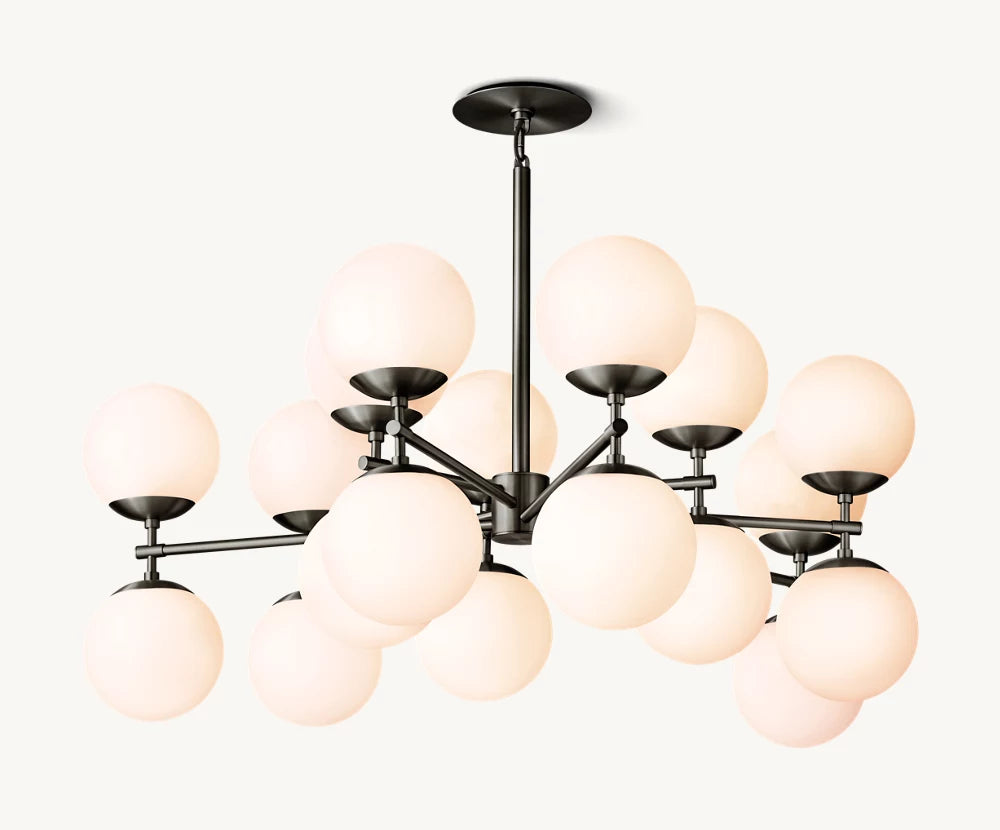 An elegant grouping of opal matte glass globes in varying sizes suspends from a refined frame in the Cirque collection. Arranged in tiers, its pure, modern form evokes celestial bodies floating in space.