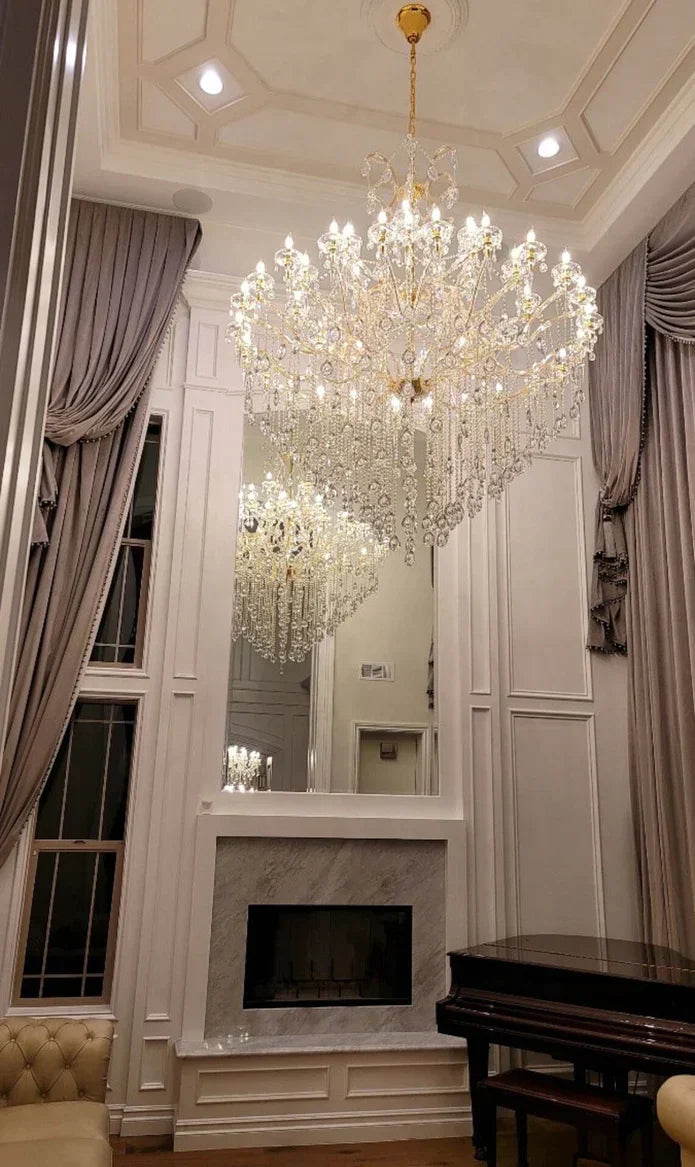 This 44-Light Candle Light Crystal Chandelier features a Gold finish and hundreds of crystal drops that sparkle to create a sophisticated atmosphere. Each arm is wrapped in glass and the chandelier is made from durable crystal, making it ideal for vaulted or sloped ceilings. This Classic Modern Multi-layers Crystal Chandelier is perfect for adding a touch of luxury to staircase, foyer, or villa.
