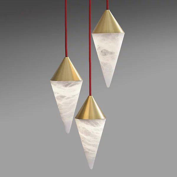 The frame is made of metal and alabaster. giving off a classic vibe. Brass cone shades add sophistication. while below. alabaster cone shades become the highlight. bringing captivating textures with their natural patterns. making the design both stylish and practical.