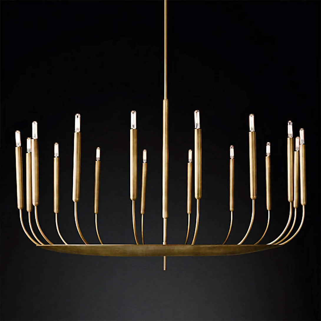 A brushed-brass frame holds twelve slender candle stems, reimagining the classic candelabra as a sleek modern chandelier. Perfect for dining tables, lofty foyers, or boutique hotel bars, it delivers a warm architectural glow while maintaining an airy, weightless presence.