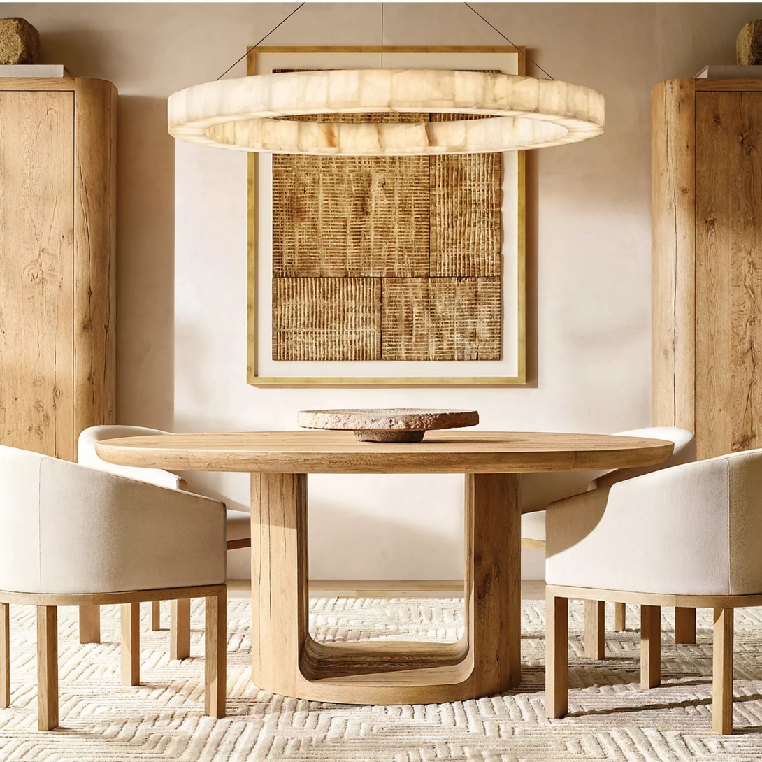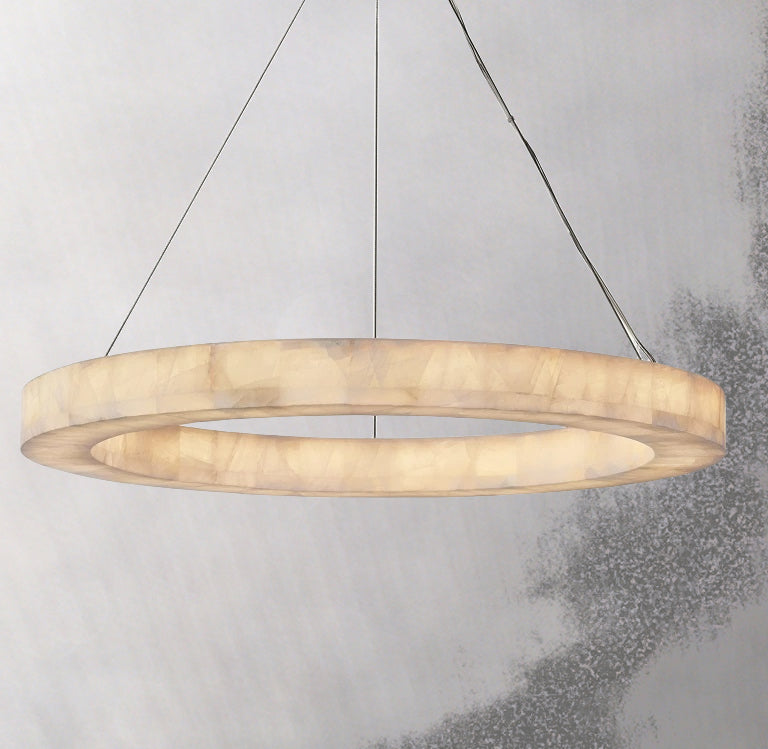 Minimalist in form and dramatic in effect, our Rivage chandelier design celebrates the beauty of calcite, a translucent stone with a warm, natural glow. Suspended from a slender steel cable, the glow of the polished stone is expertly stitched together to create a smooth, continuous surface, while subtle light from within highlights the organic colors and veins.