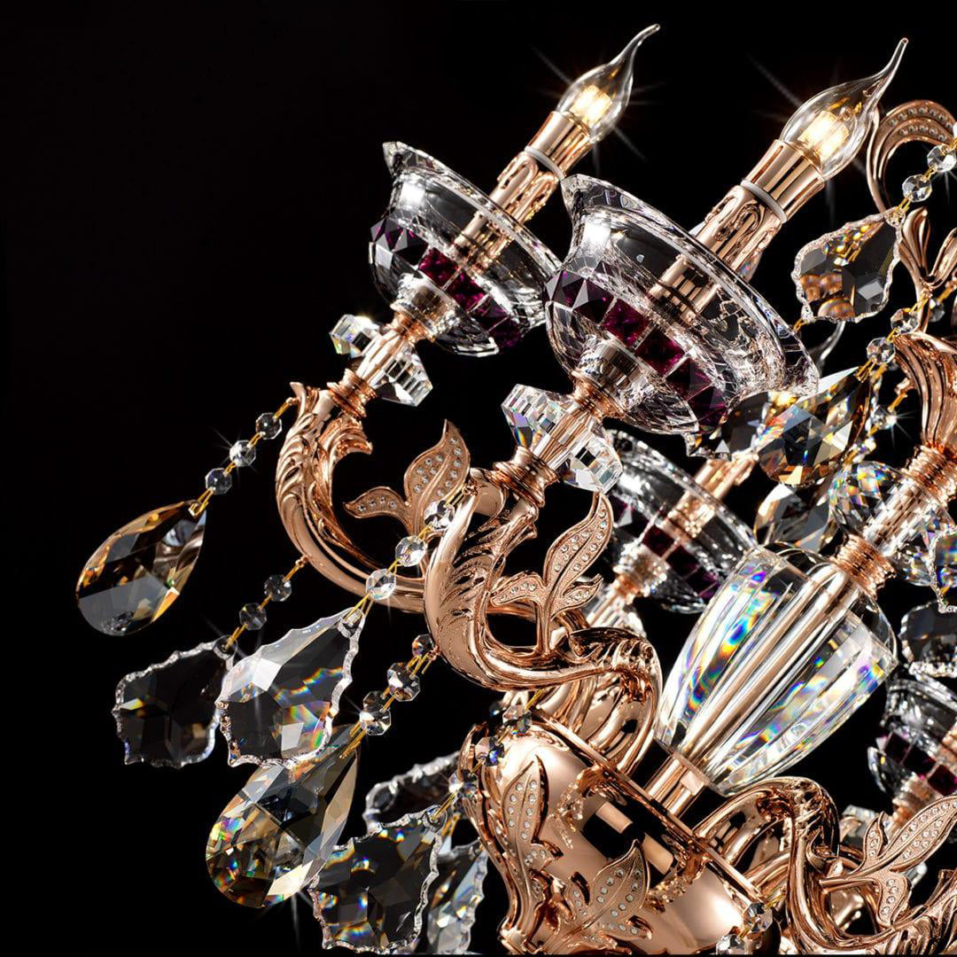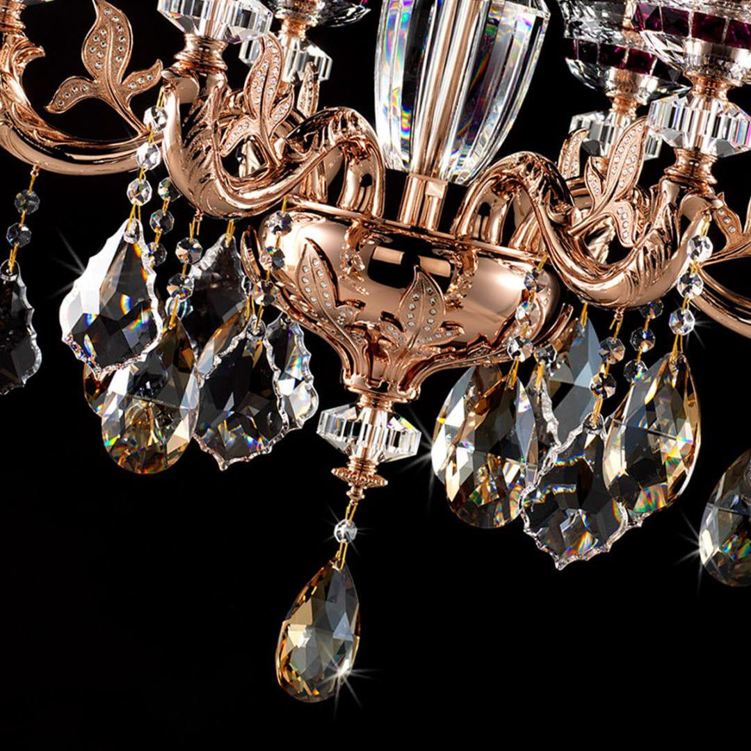 This creative and classic Egyptian crystal brass chandelier. It is made of high quality brass that has been hardened at high temperatures and treated against mold, corrosion and deformation, with a rose gold finish. The clear K9 crystals are polished with a fine cutting process to reflect a dazzling light. Selected Asfour crystal jewelry from Cairo, Egypt is pure, clear, smooth and hard. Place this stunning collection in your home and you will enjoy the luxury and coziness of European style.