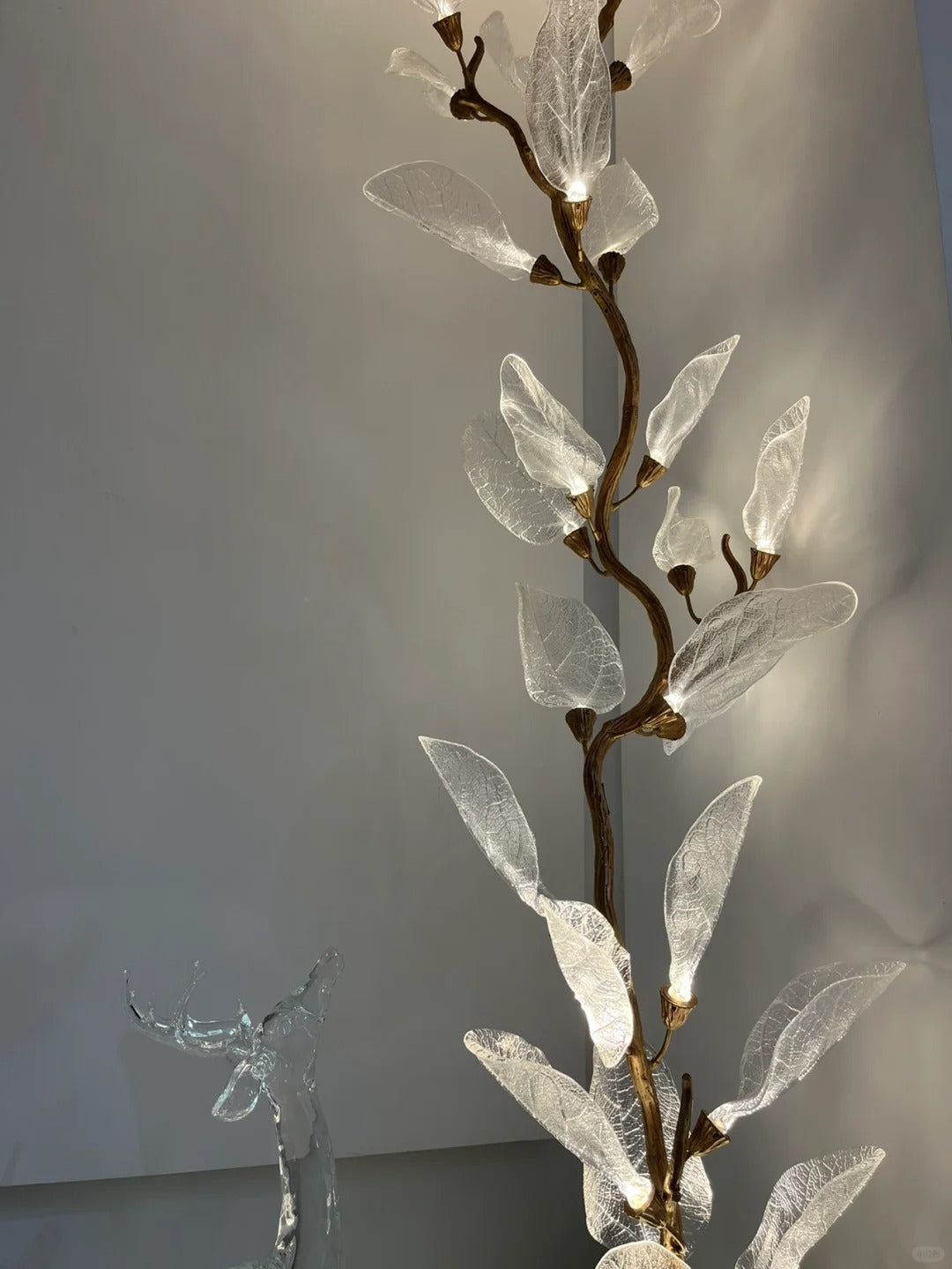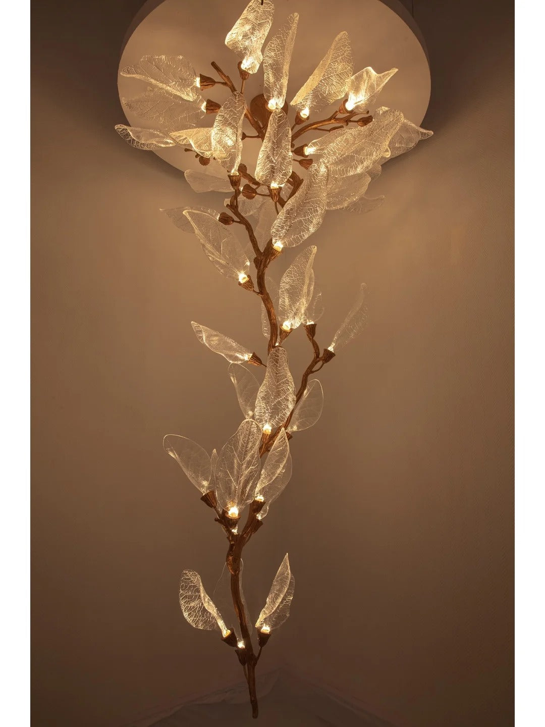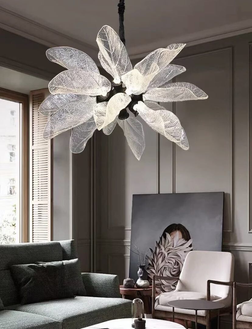 The body of the artistic chandelier is made of resin and iron material.This chandelier features its clear flower design trimmed with eighteen resinous, vivid petals, whose veins are elaborately carved as if it were real.Each petal contains one single bulb, diffusing and softening the illumination in a moderate and gentle way, creating an elegant and graceful ambience in any space.Ideal for modern lighting in the living room, girl's bedroom or dining room.