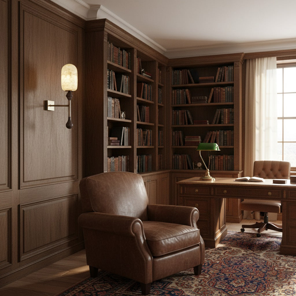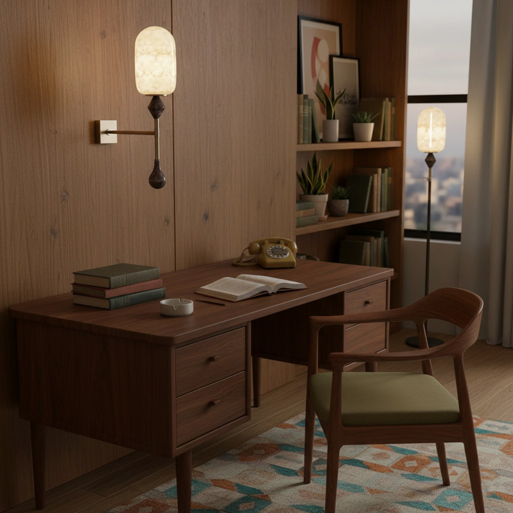 The Dakota Alabaster Wall Lamp combines metal and marble for a refined, sturdy body, topped with an elegant alabaster lampshade that diffuses light softly. Its sophisticated design adds warmth and timeless style to any interior, making it a perfect accent for living spaces or bedrooms.