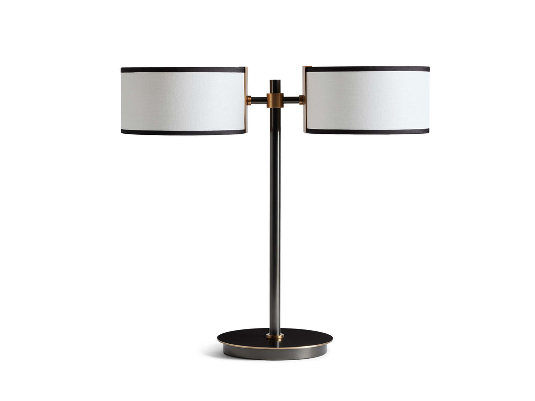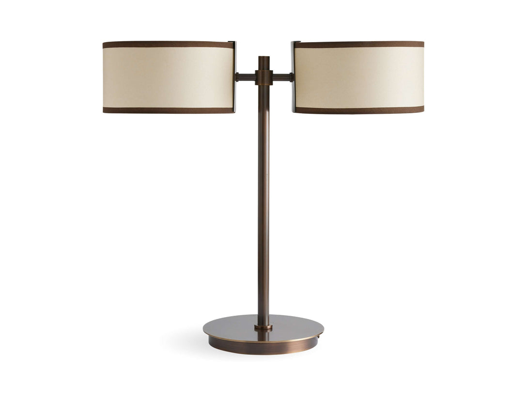 - Bronze fixtures include a white linen shade with black trim; light bronze fixtures include a cream parchment shade with brown trim.