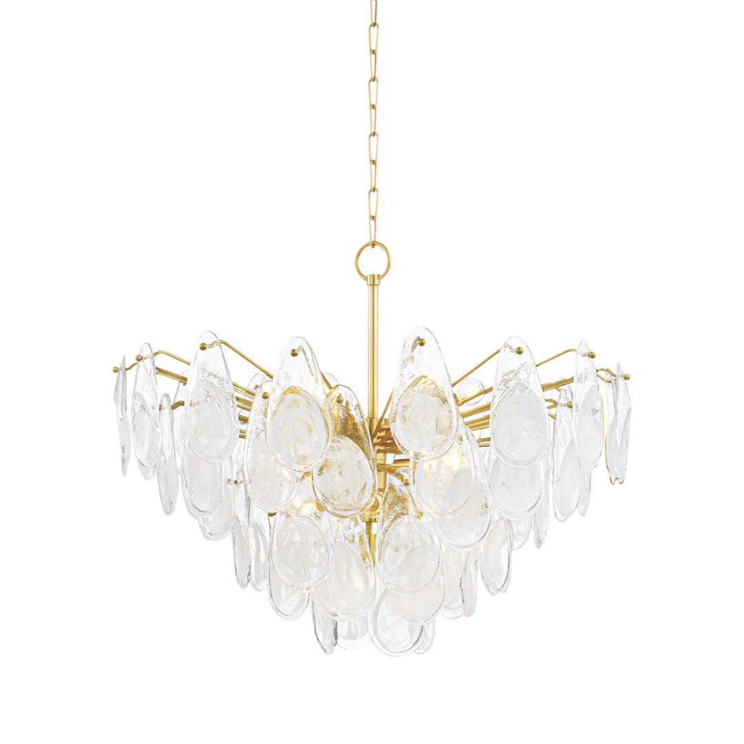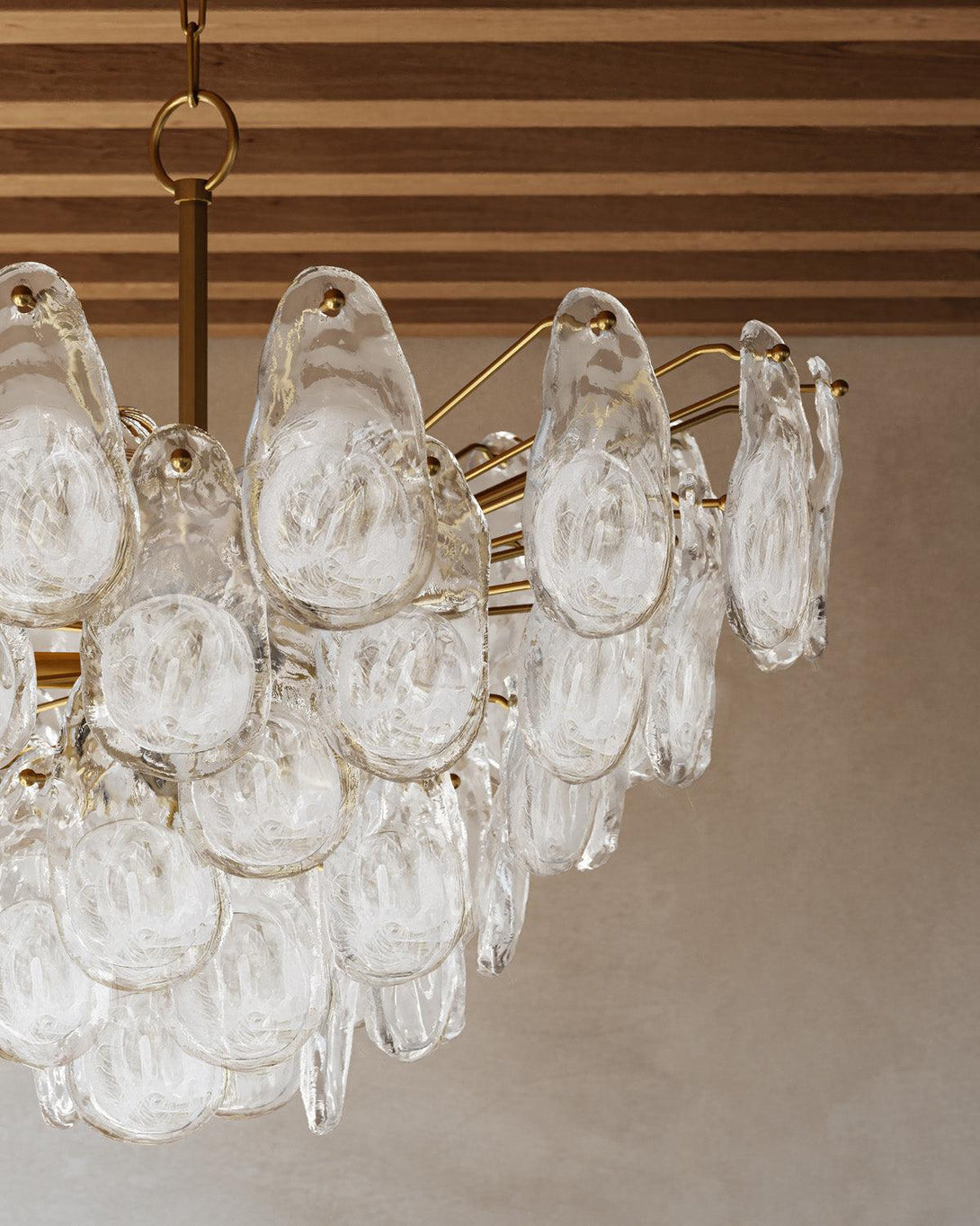 Smooth Blonchino Piastra glass teardrops are suspended in tiers from the waterfall-like Darcia.Reminiscent of shells or falling rain, the hand-blown glass pieces sparkle as they soften anddiffuse the light. Available as a sconce, or as a chandelier in three sizes, Darcia makes a poeticand organic statement.*Due to the one-of-a-kind nature of the medium, exact colors and patterns may vary slightly fromthe image shown.