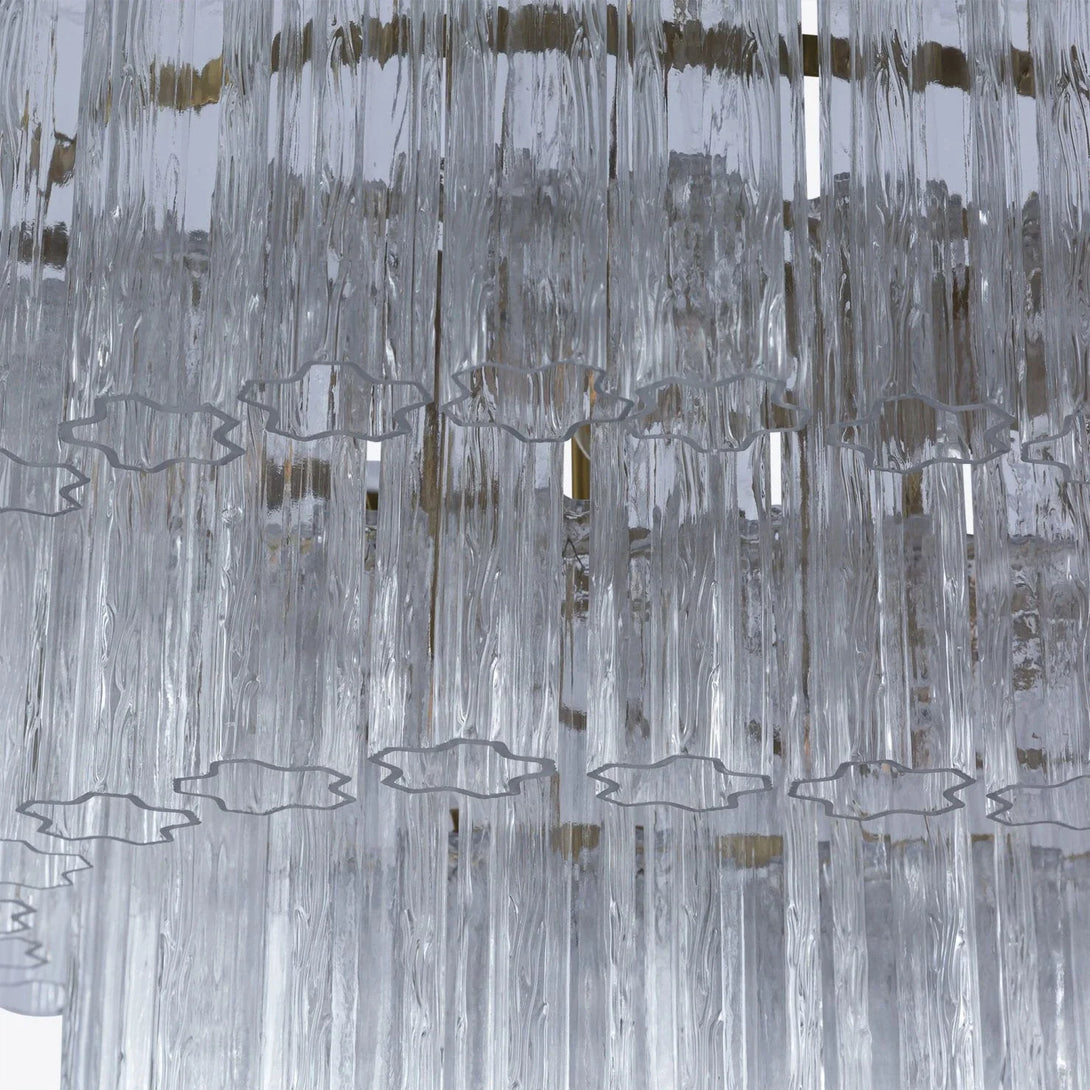 Four tiers of fluted glass tubes create this beautiful mid-century inspired dining chandelier. The textured glass tubes are individually hung from an oval shaped Satin Brass frame. This style is available in three colours; a rich, sophisticated Smoked Quartz, a fresh blush Pink or clear glass. Ideal for hanging over dining table.