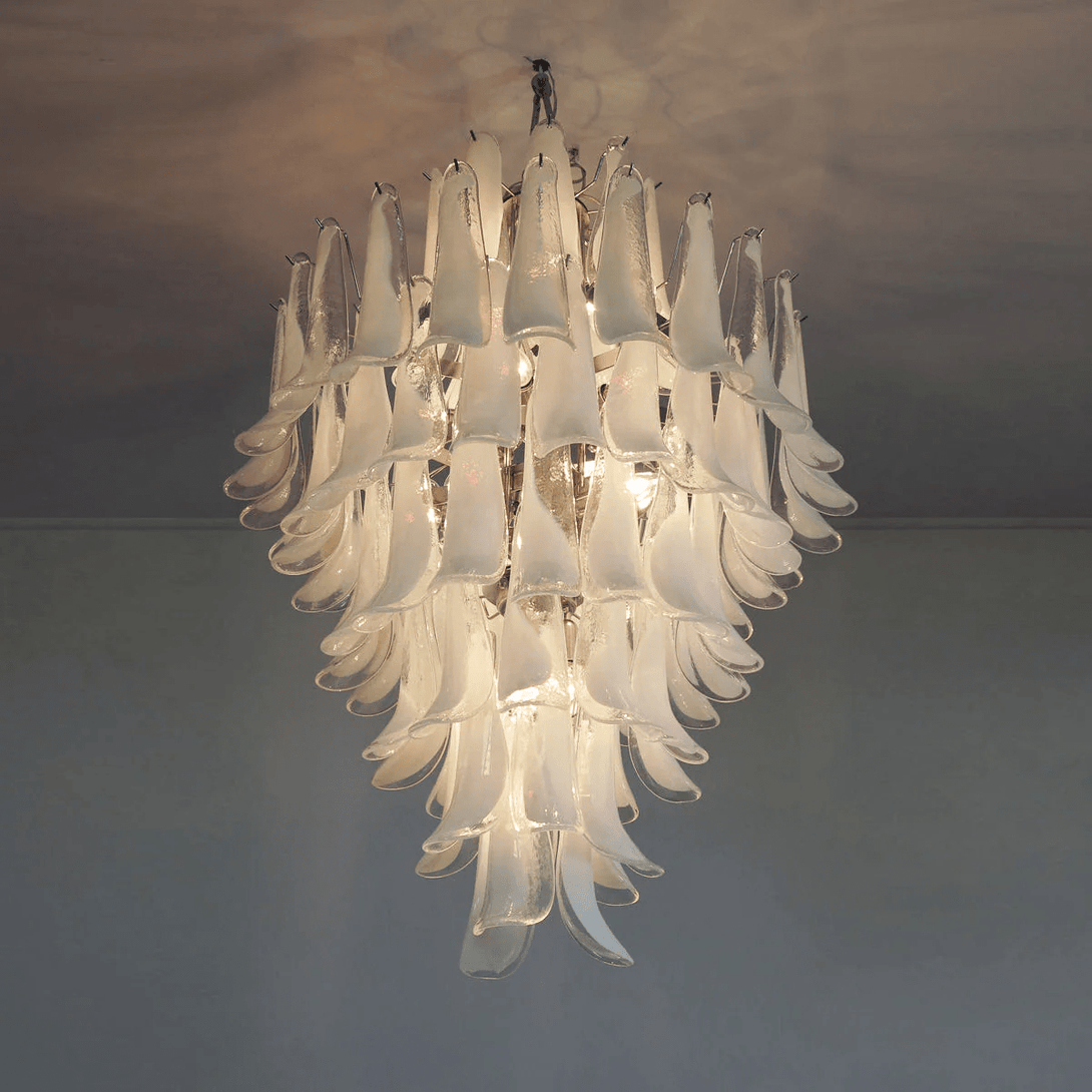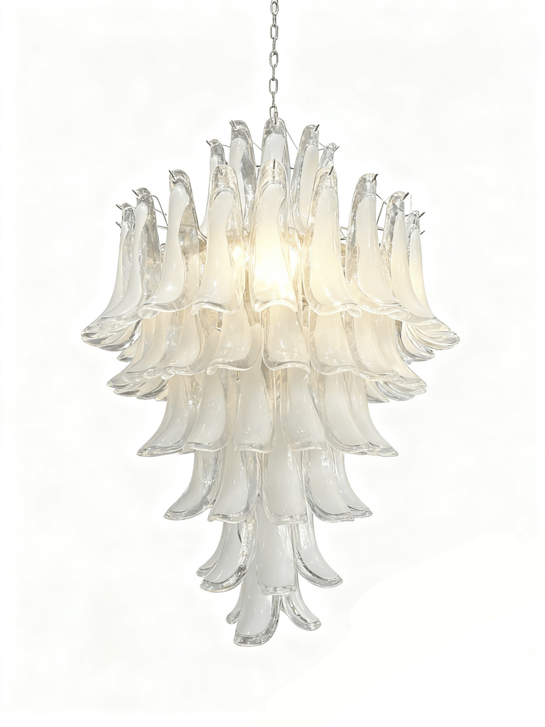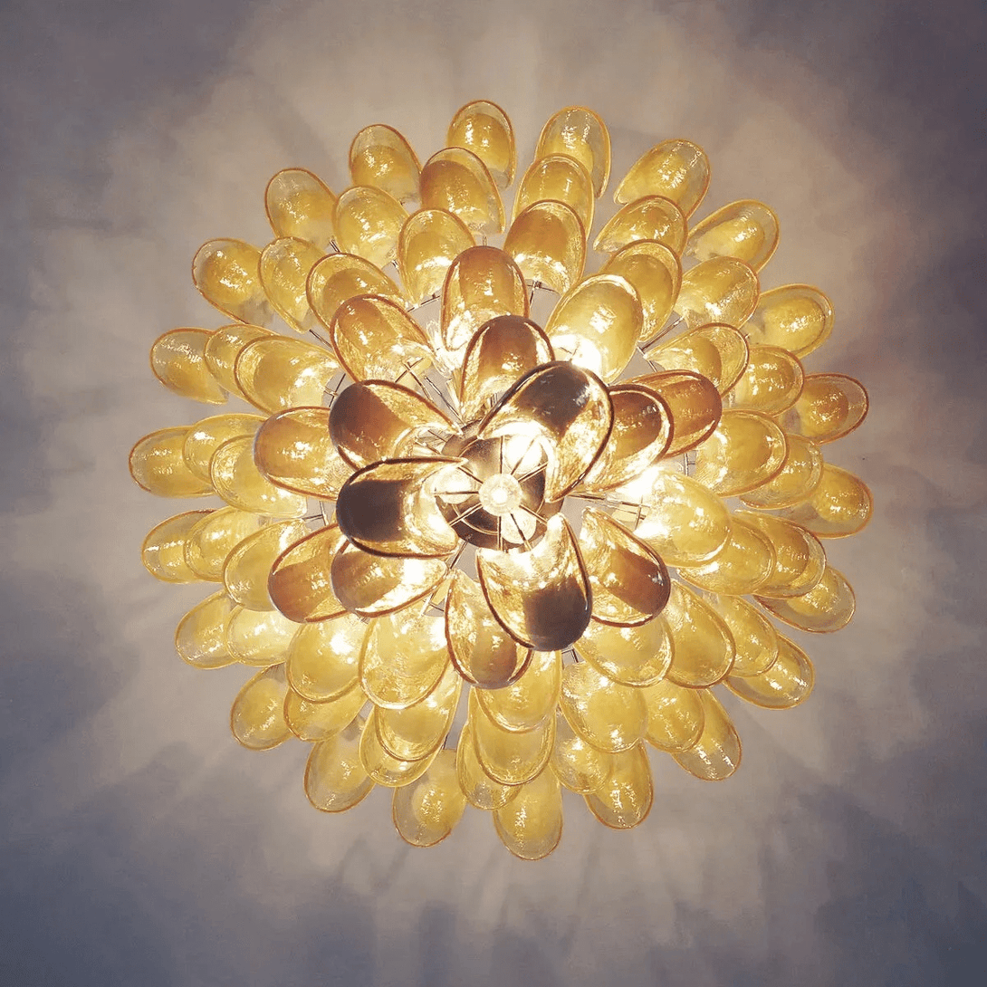 Introducing the Dravina Pendant Lamp by Vakkerlight — a bold, sculptural lighting statement inspired by the untamed elegance of cascading petals and molten glass. Crafted from layers of hand-formed amber and ivory Murano-style glass, each curved element flows downward like flickering flames or falling feathers, creating a sense of organic movement and radiant drama.