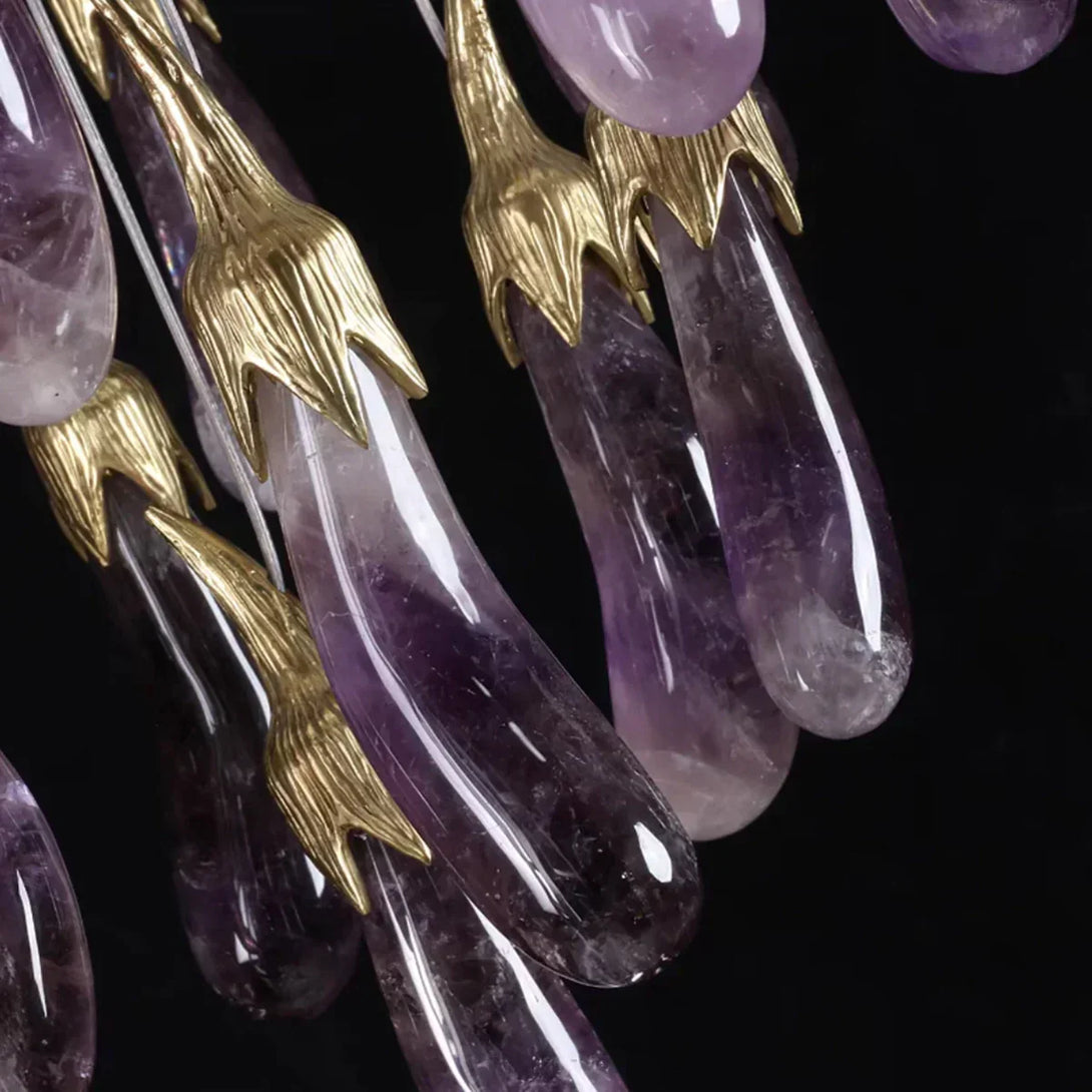 This Chandelier combines exquisite aesthetics with functionality. Crafted to resemble the elegant contours of an eggplant, this chandelier infuses spaces with a touch of whimsy and sophistication. Its rich purple hue adds vibrancy and warmth to any room, creating a captivating focal point. Perfect for those seeking unique decor, this chandelier seamlessly blends artistry with illumination, elevating interiors with its distinct charm.