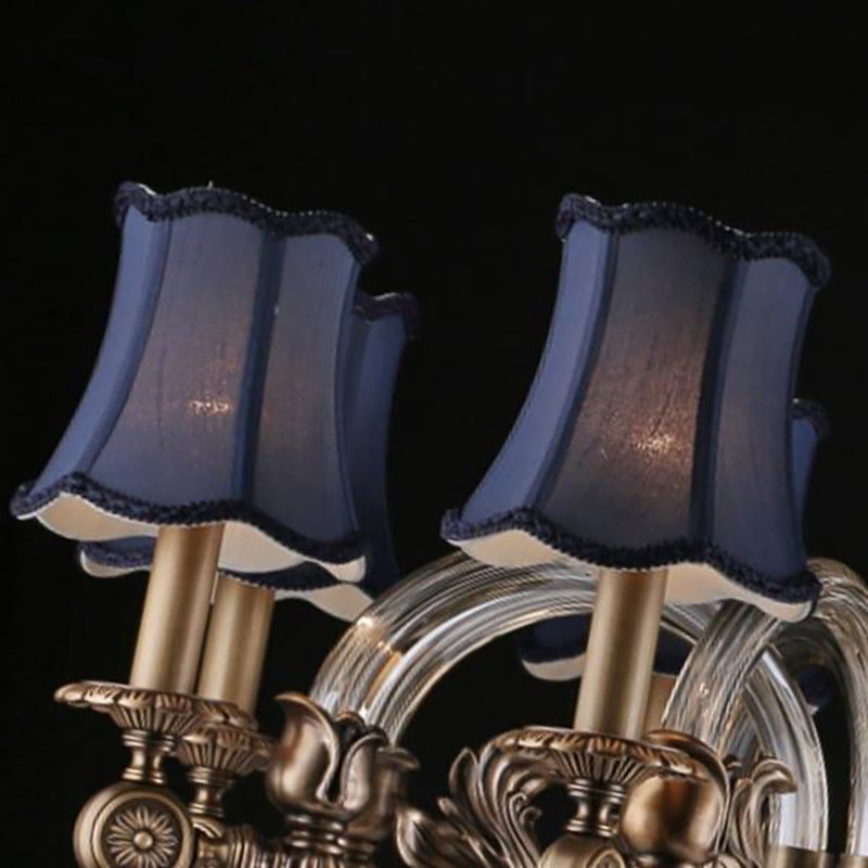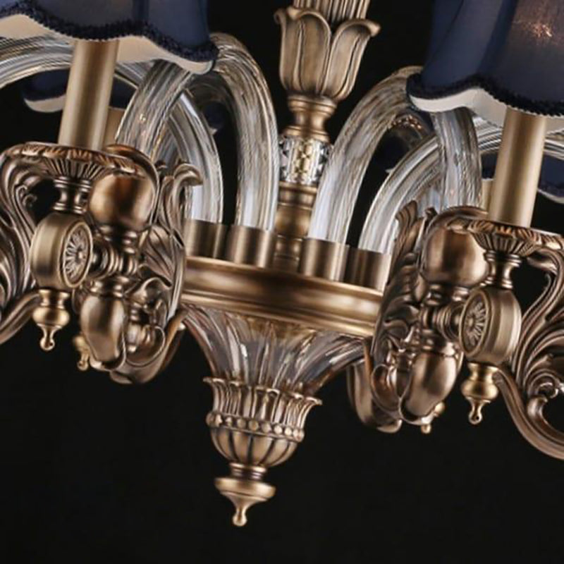 This collection is European style classical and elegant chandelier made of copper, glass and textile. The lamp body is made of dark-bronze copper. Produced through many exquisite handcraft procedures such as sand casting, and carved through exquisite skills, it is firm, stable, anti-rust, anti-corrosion, anti-scratch and non-fading. The blended glass tube of the lamp arm, transparent and shining, is stable and firm in structure with fluent and nice edge lines, showing luxury and magnificent vibe. When reflected by the light, the glass tube shows a three-dimension visual effect. The textile lampshade colored with royal blue is exquisitely made by hand, providing a mysterious and graceful vibe and showing the art of color matching. The light penetrating it is gentle and natural.
