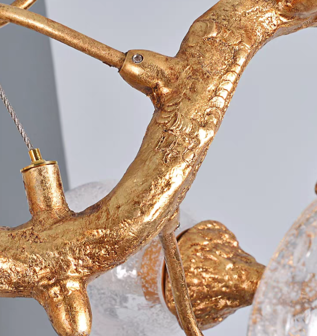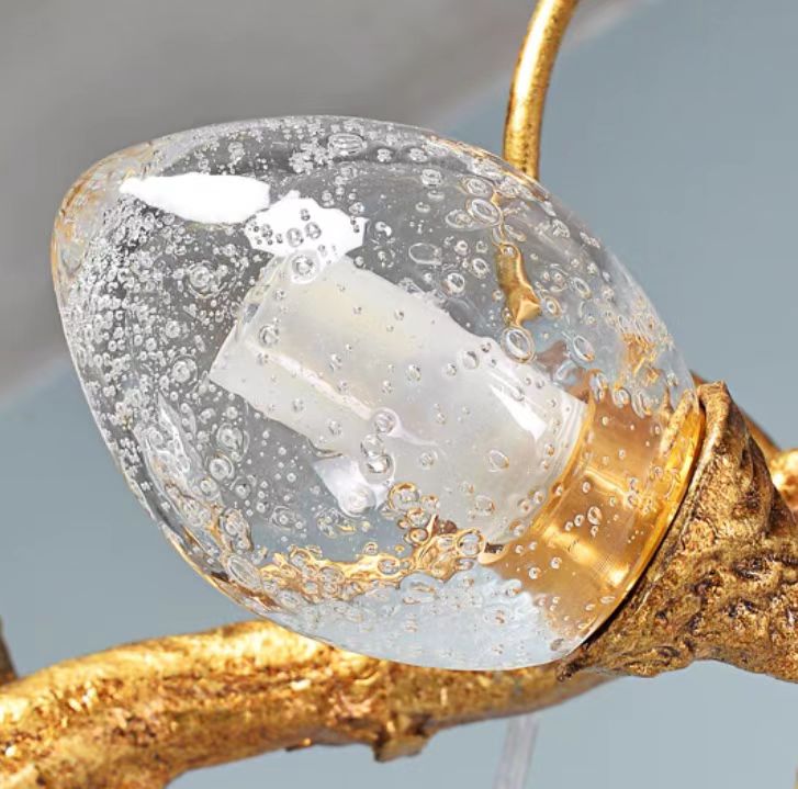 This luxury pendant light features its lifelike, vivid branch form in brass finish, which is elaborately carved. It is designed as a unique shape with an egg-shaped glass shade containing many bubbles inside. The bubble glass is fantastic and clear. The light transmission is even and soft, with no harshness, bright and comfortable. It gives an elegant, non-traditional, and romantic style, making the vision more three-dimensional. Whether as a decorative piece or a lighting fixture, it makes a statement.Perfect for the dining table, kitchen island, living room, etc.
