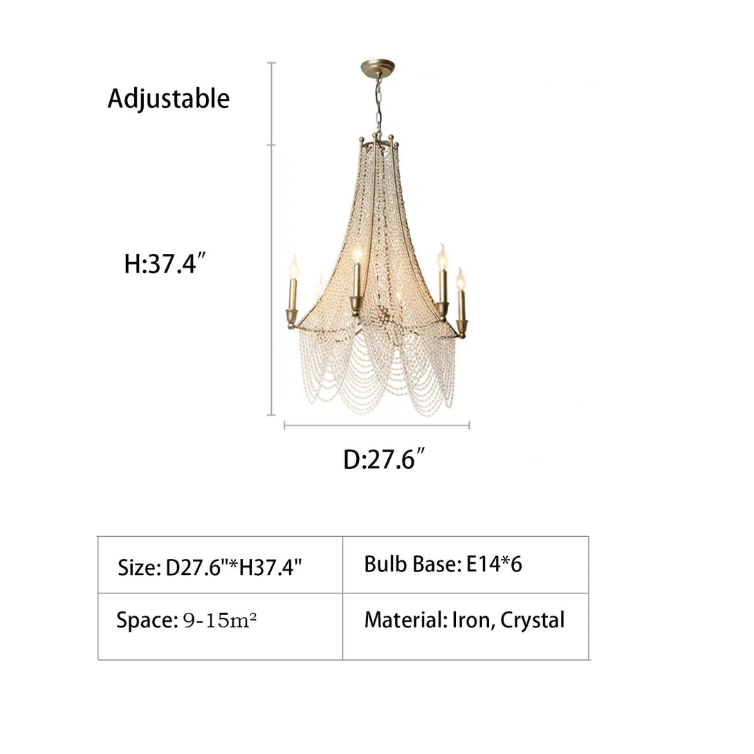 The body of this chandelier is made of high quality crystal.Like a huge white trumpet flower hanging from the ceiling, this Bohemian style chandelier features petticoat-shaped iron frame trimmed with candle-shaped bulb stems with little dish cups. Numerous strands of crystal beads woven together, and the extra part of the bottom is well arranged like valances hanging freely from the champagne colored frame. Extra large size, ideal for high-ceiling rooms. like living room, staircase, big bedroom, etc.It's absolutely stunning whether the lights are on or off.