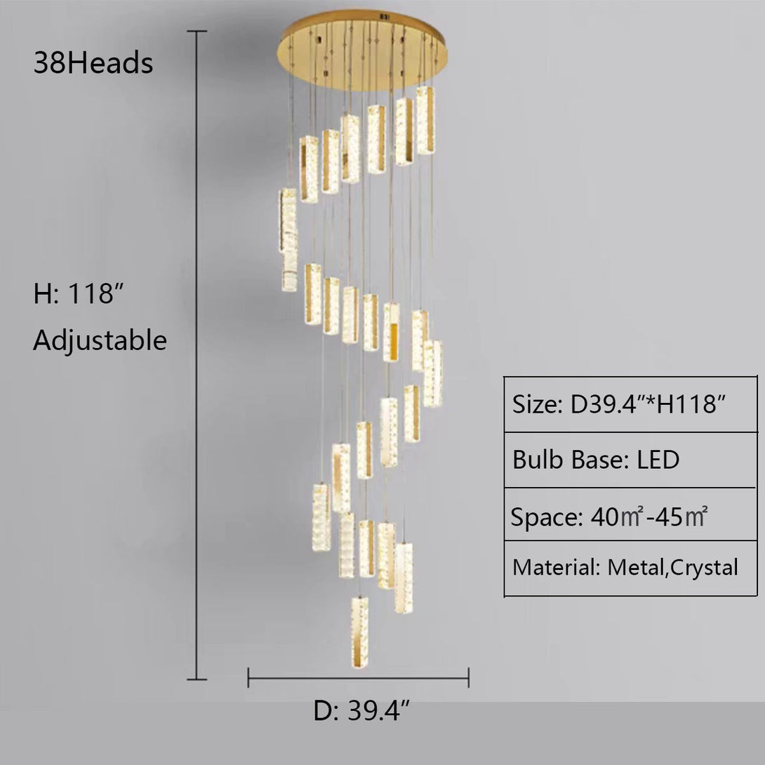The body of this simple long crystal chandelier is made of stainless steel and high quality K9 crystals, which have been treated with multiple processes for saturated color and durability. It is designed in a luxurious modern style with a long crystal pendant dangling from a stainless steel rope in a spiral upward shape. It is absolutely stunning whether the lights are on or off.Perfect for staircase,loft,two-story foyer,duplex hall,high-ceiling living room,etc.