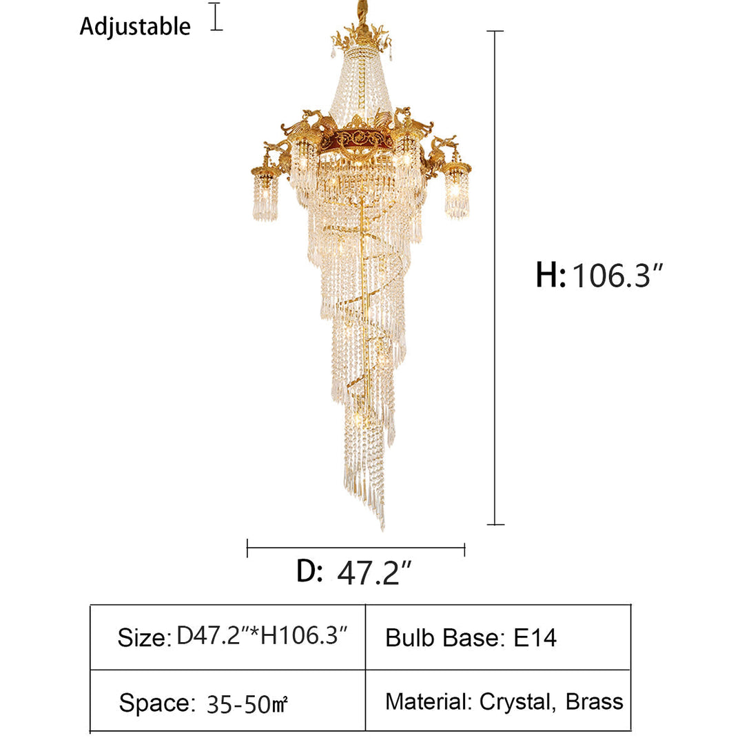 The body of this chandelier is made of brass material with multiple processes for saturated color and durability. It is designed in a mid-century vintage yet luxurious and atmospheric style. The upper part has an all-brass swan carving cover and each carving has a large crystal in the shape of an angel's tear underneath, which is connected by crystal beads to a larger circle of exquisite swan carvings. The lower crystal beads are dangling in layers, giving a sense of luxury and atmosphere. Suitable for installation at the stairs, villas, duplexes, etc. Whether the lights are on or not, it is absolutely stunning.