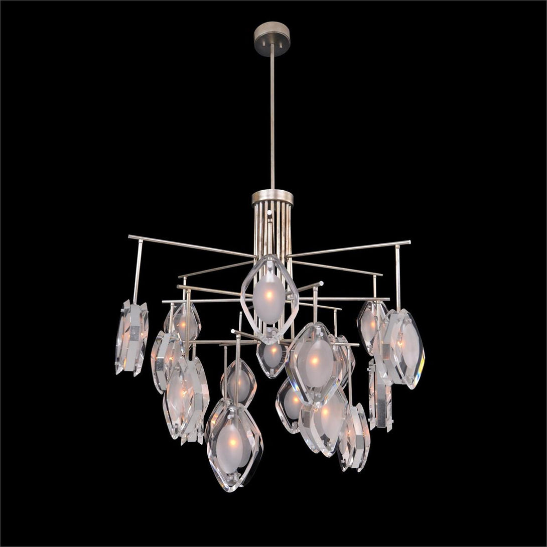 An elegant eighteen-light chandelier in an antique silver finish. Clear and etched glass paired with faceted crystals refract light into a dazzling prismatic display, bringing brilliance to any interior.