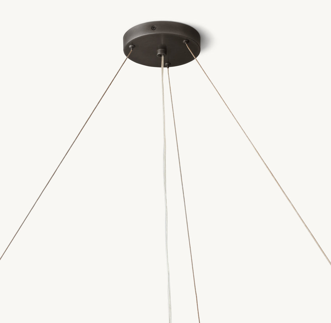 - Hangs from a clear cord and slender cables; may be shortened at time of professional installation