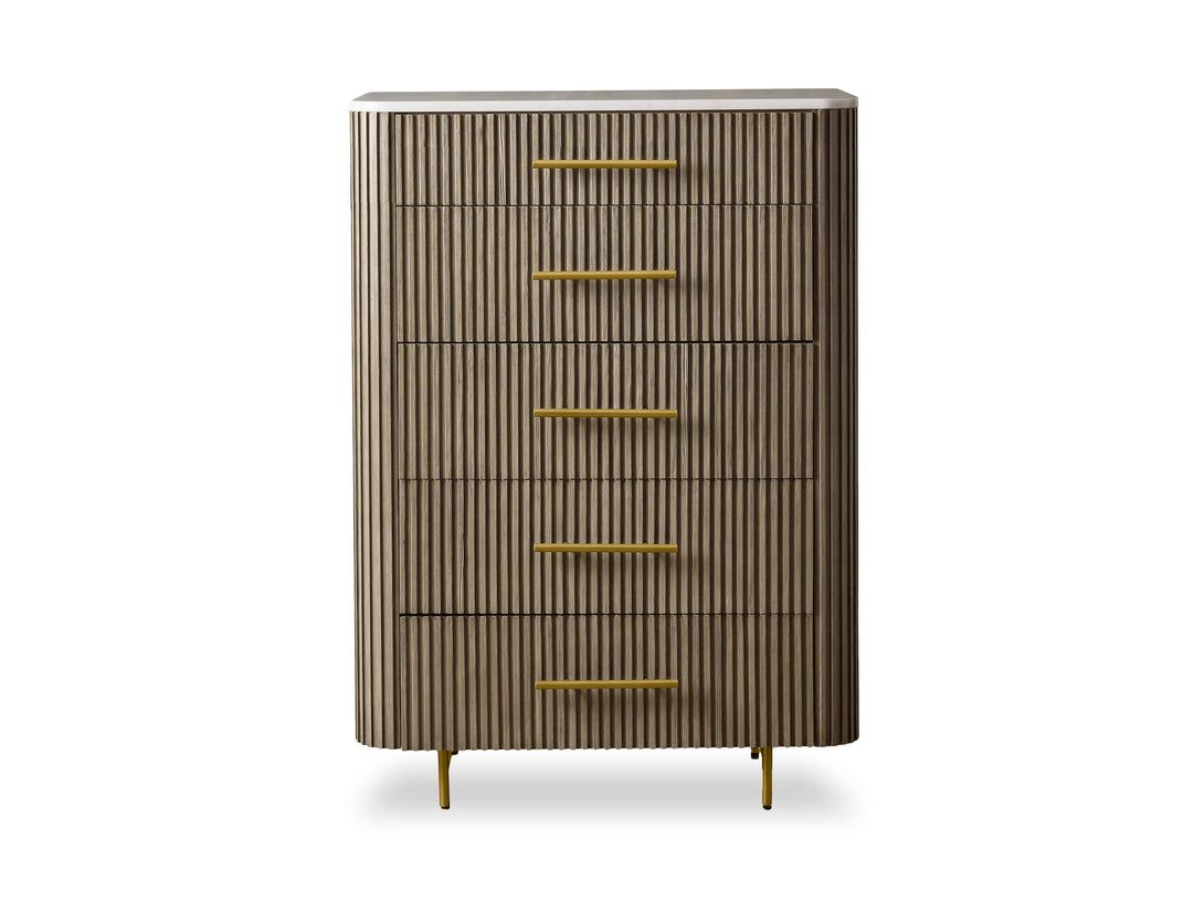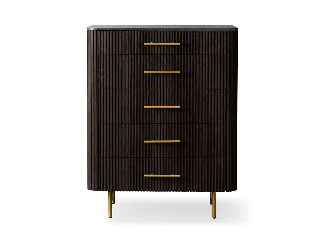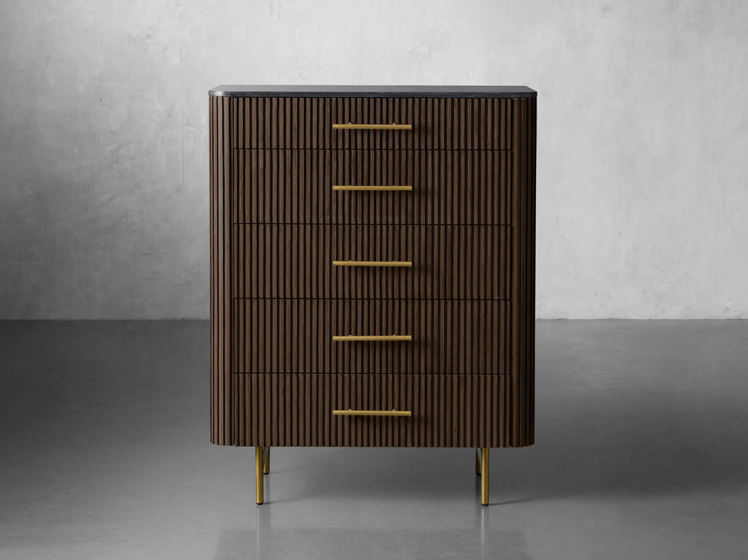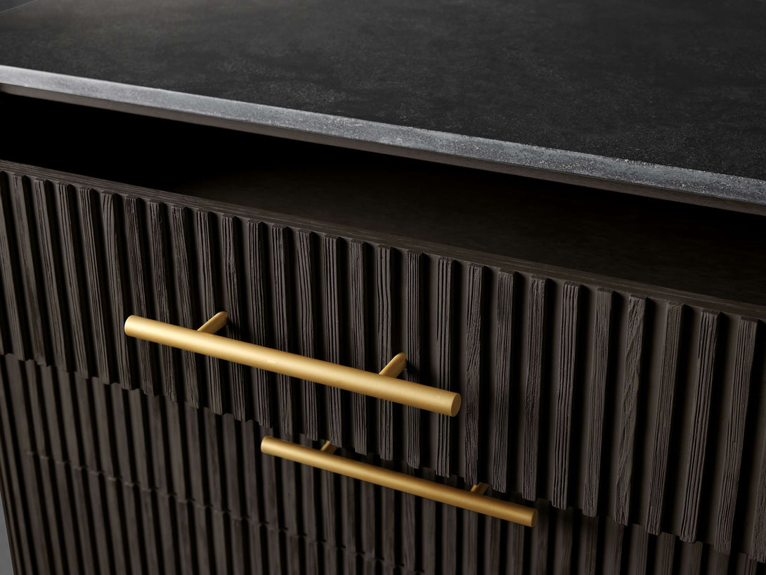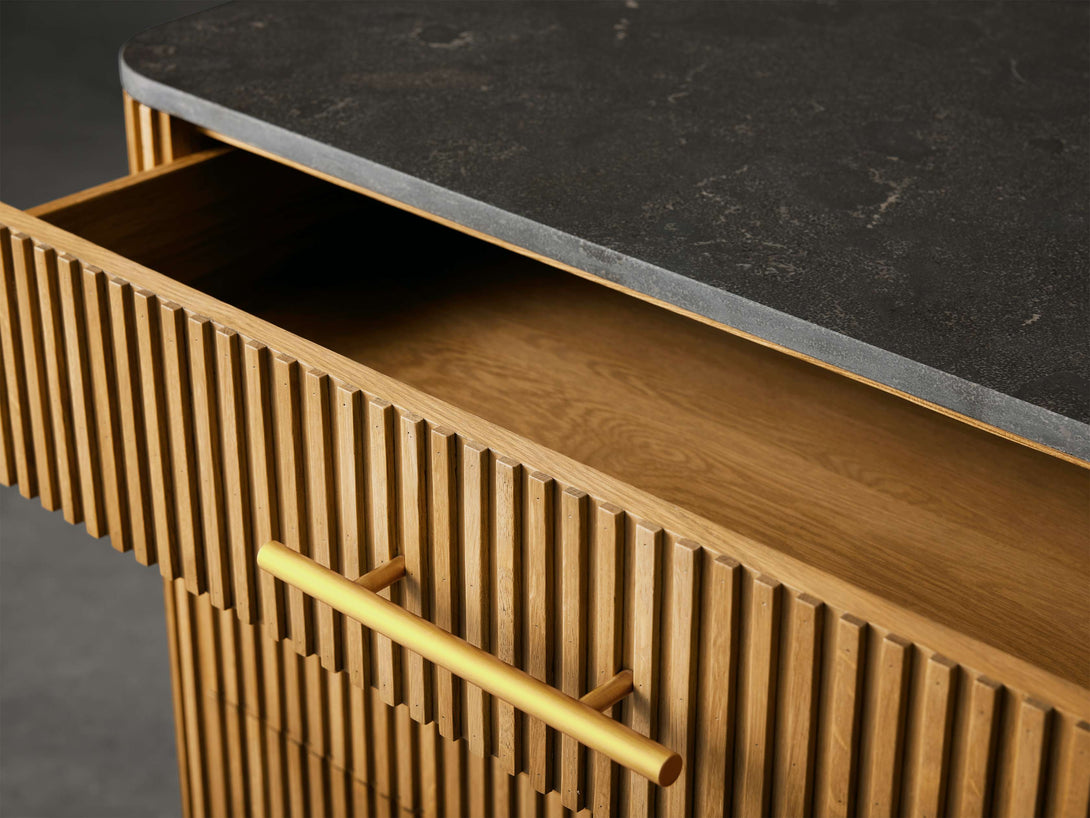 - Wood surfaces are hand-stained with a striking finish and protective lacquer for subtle sheen.