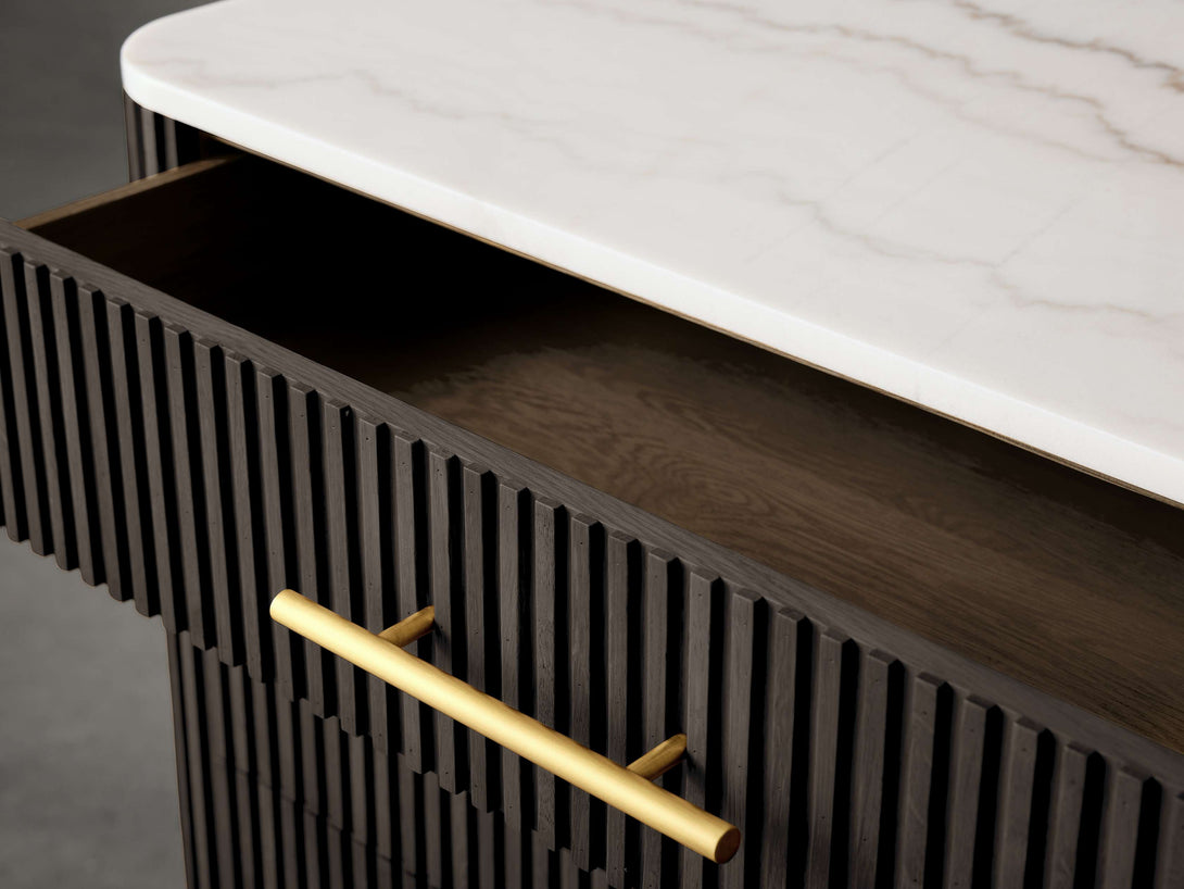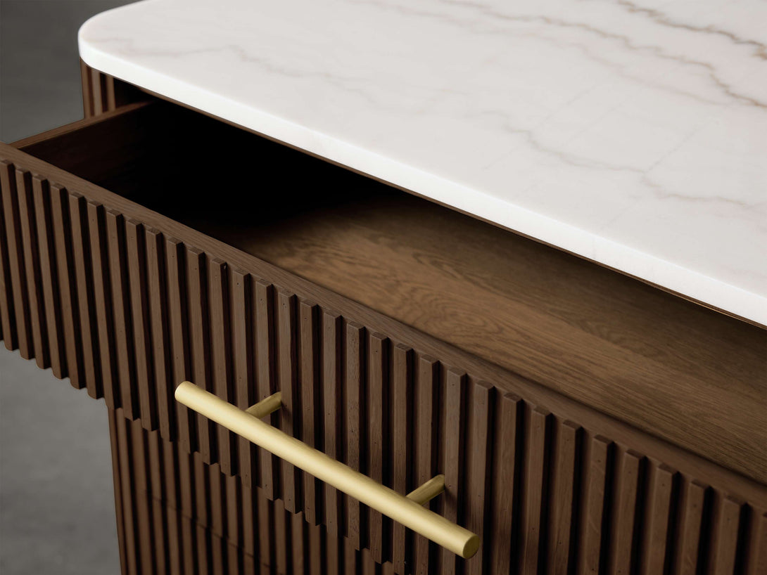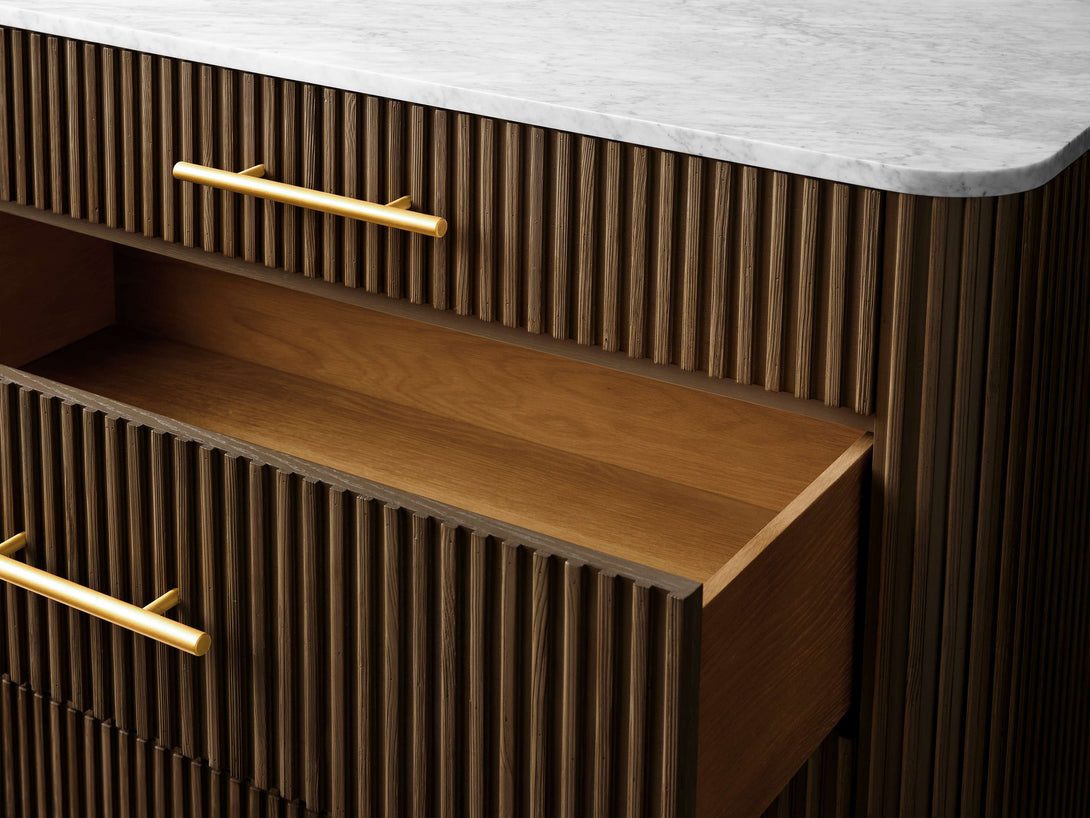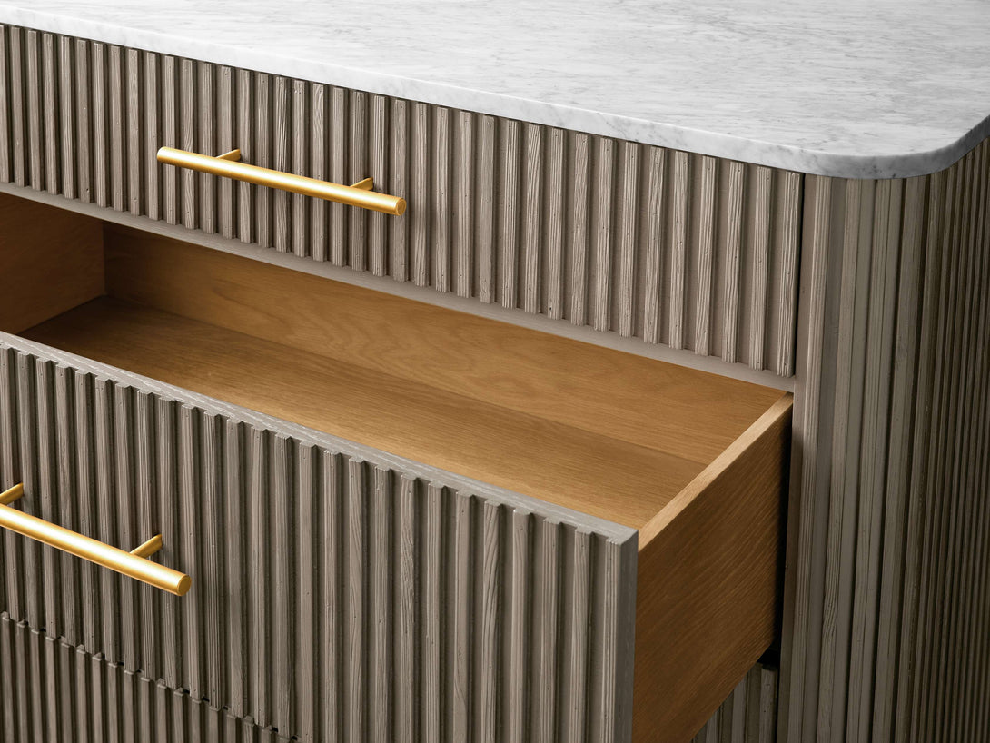 - Craftsman-built pieces feature reinforced mortise-and-tenon joinery for added strength and stability and are complemented by your choice of Carrara marble, white marble, or bluestone tops.