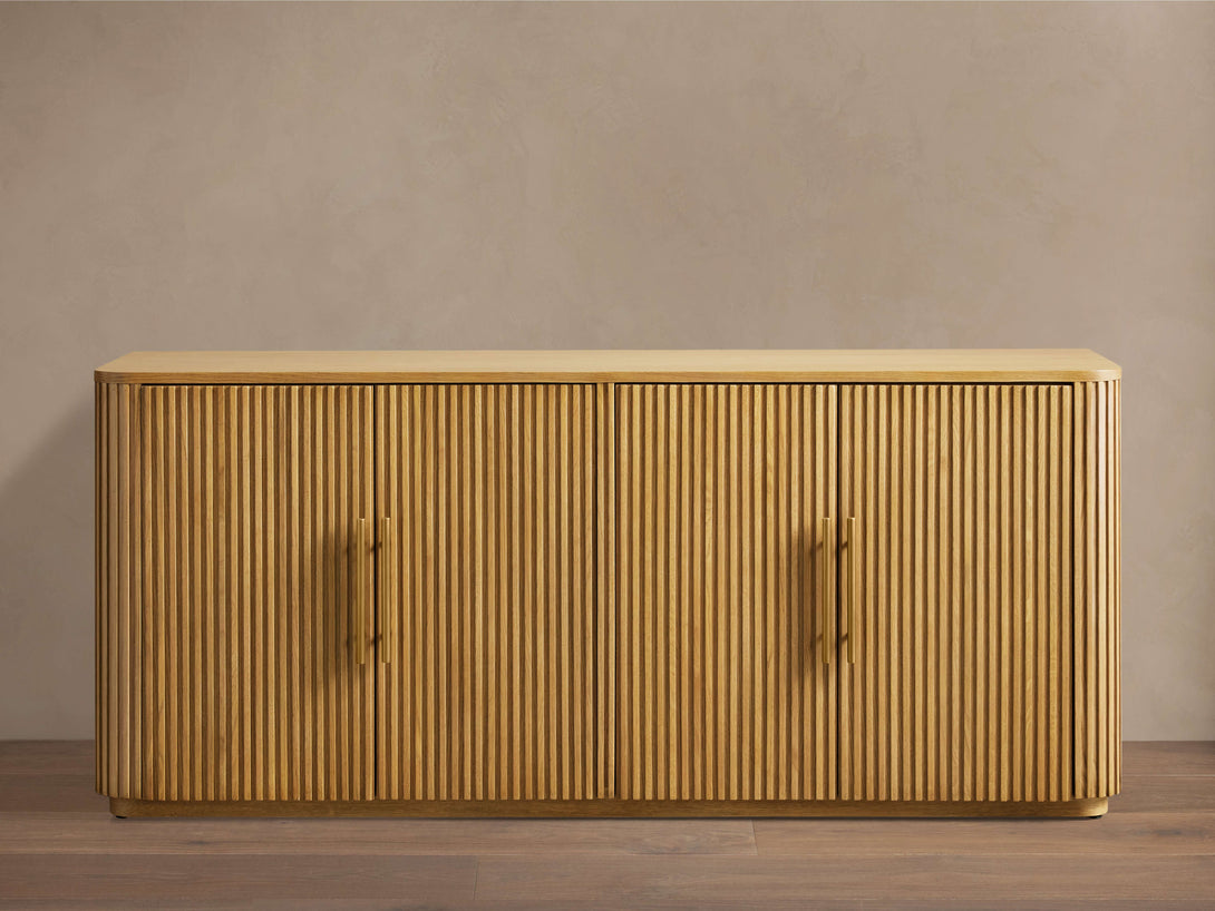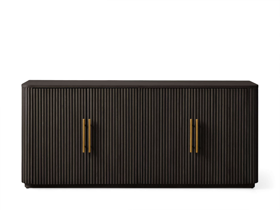 - Zinc-alloy hardware and plinth base feature a brass finish.